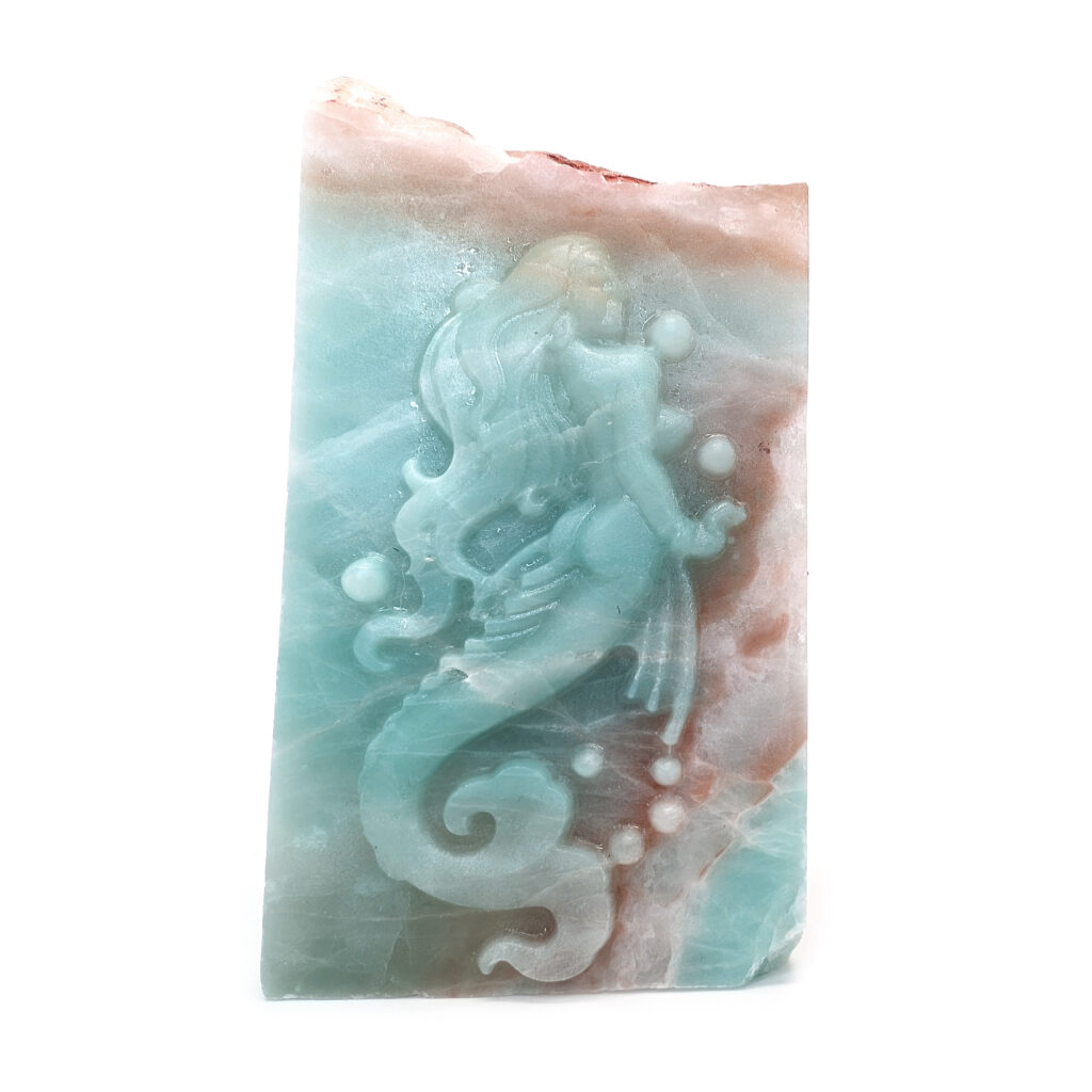 A translucent amazonite mermaid carving the color of sea foam, unpolished matte finish with white and yellow/brown veining.