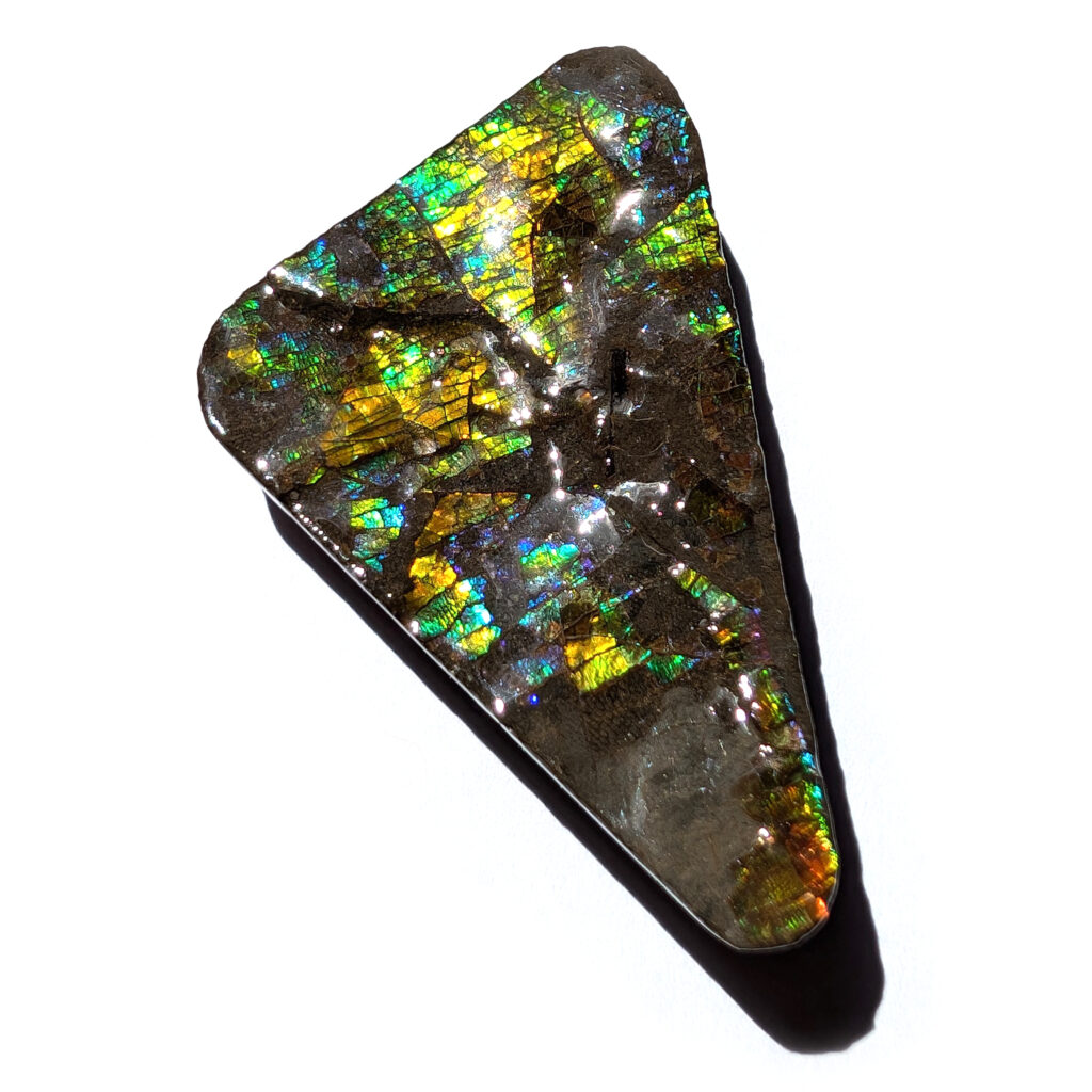 A piece of ammolite with a flat matrix back. Made of the fossilized shells of ammonites, ammolite is an organic gem-quality stone with an opalescent flash. Mined in Alberta, Canada, it is composed mainly of aragonite.