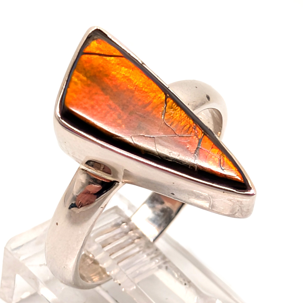 An ammolite ring featuring a triangular multi-color ammolite cabochon bezel-set in a simple sterling silver ring. This one flashes mostly red and orange, also green (not pictured).