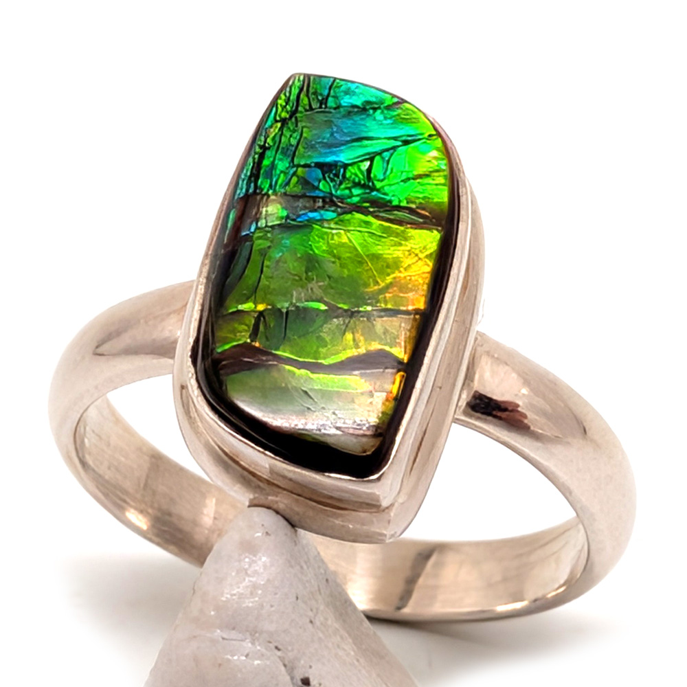 An ammolite ring featuring a teardrop multi-color ammolite cabochon bezel-set in a simple sterling silver ring.