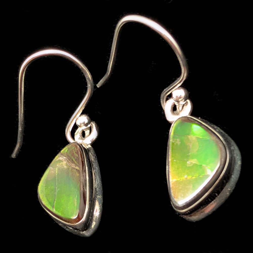 A pair of ammolite earrings featuring triangular ammolite fossil cabochons with rainbows of color, bezel-set in simple sterling silver dangle earrings.