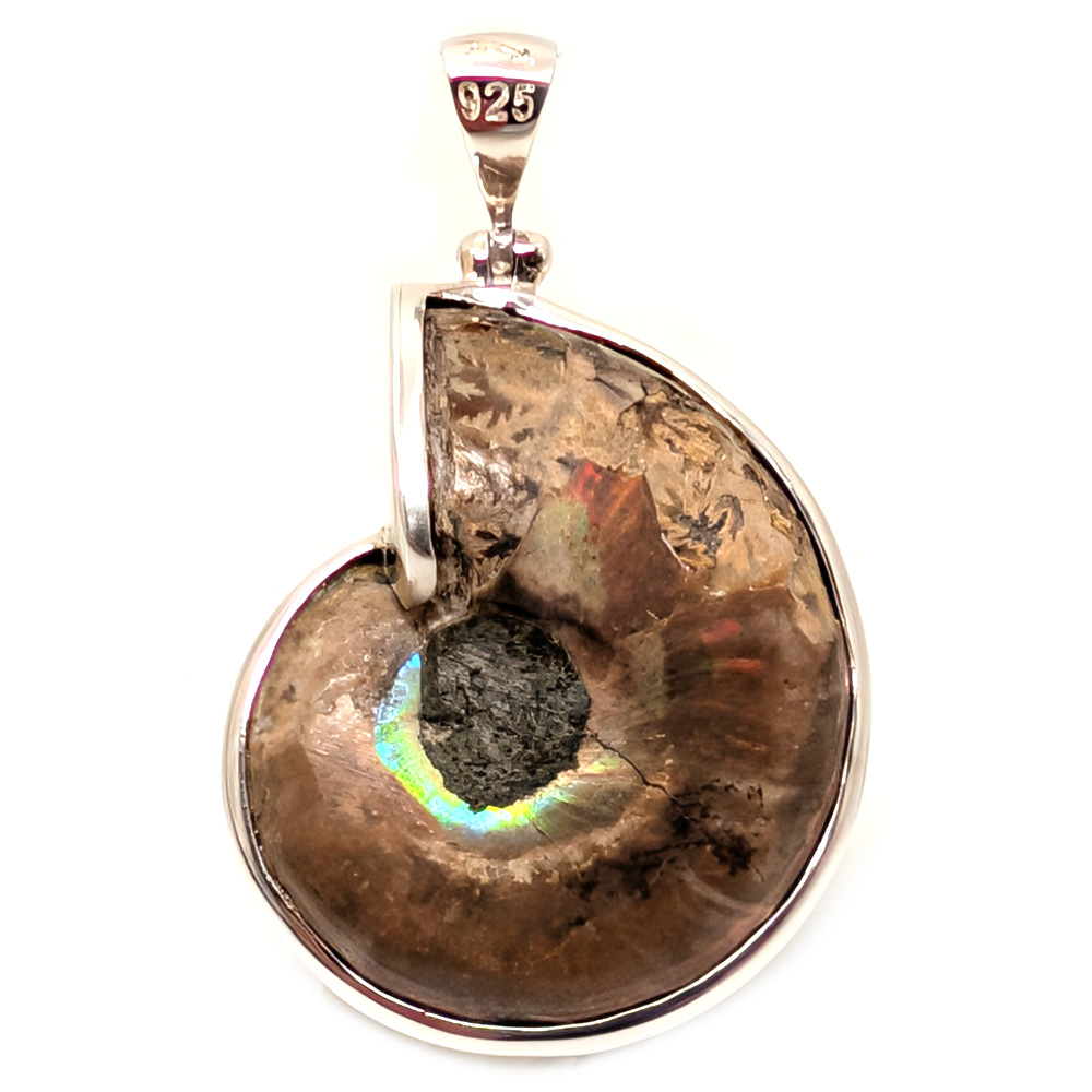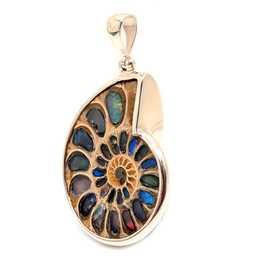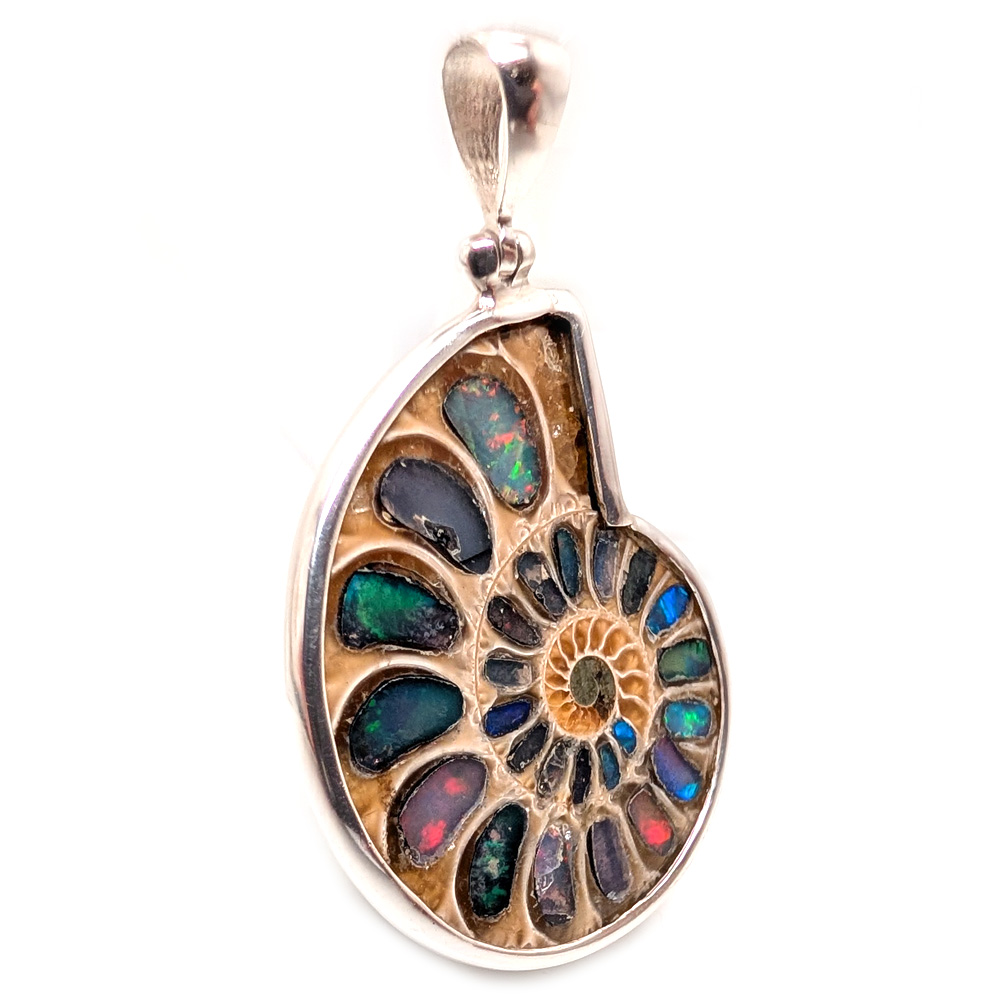 A dazzling fossilized ammonite pendant with opal inlay, featuring one half of an ammonite fossil from Madagascar with Australian opal inlaid in the outer chambers of the ammonite’s fossilized shell, bezel-set in sterling silver. The inner chambers of the ammonite are aragonite, which replaced the original shell during fossilization. The back of the ammonite features slight flashes of red, green and blue iridescence.