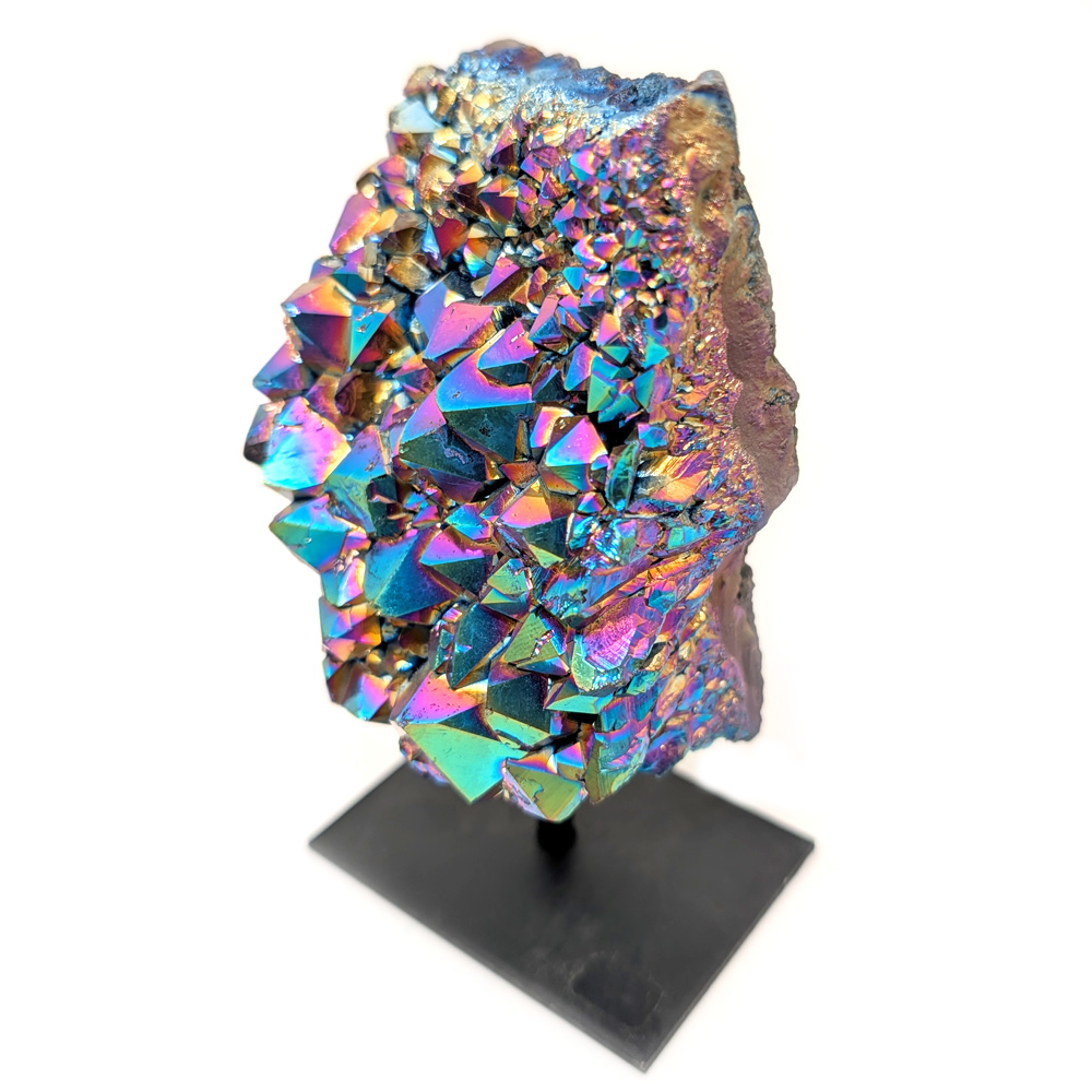 Aurora quartz cluster on a stand: a beautiful, metallic, rainbow-colored, iridescent quartz crystal cluster coated in titanium, mounted on a custom steel stand.