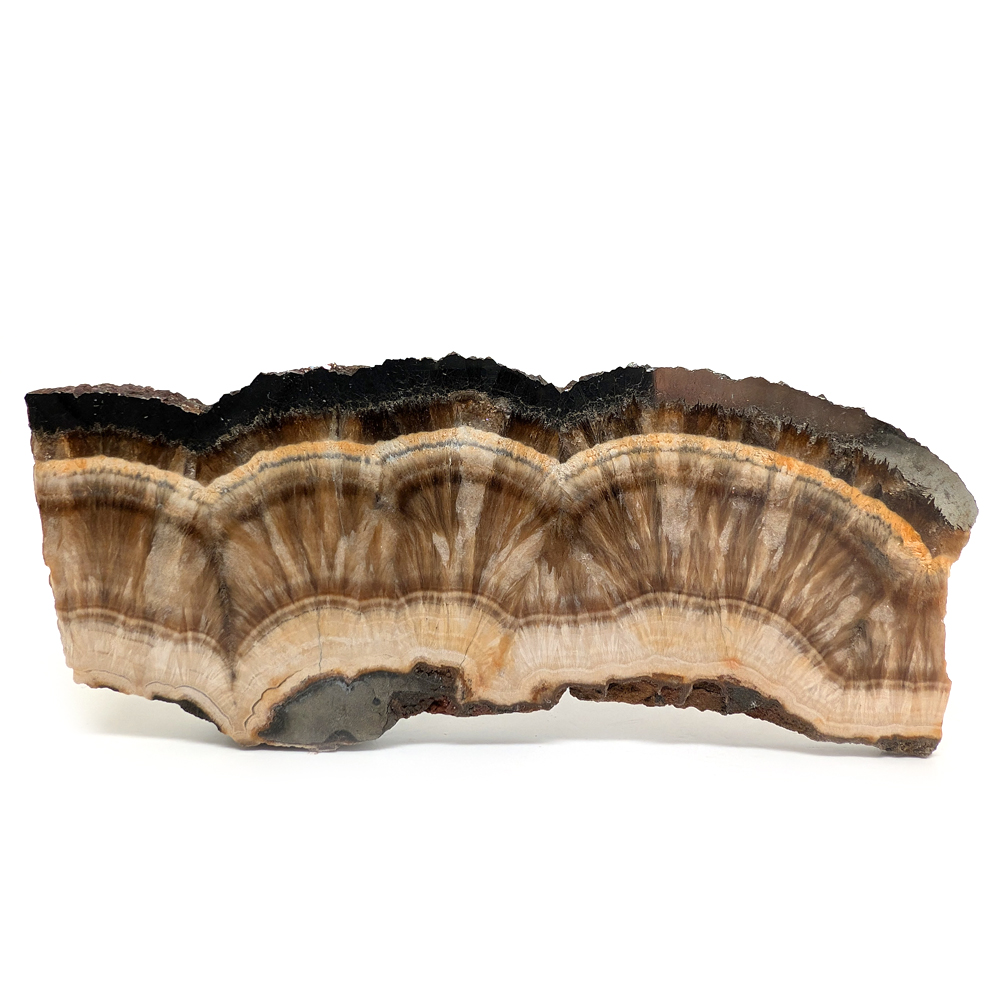 A beautiful slice of a rare combination of Barite and Marcasite from Poland, polished on one side to show the intricate patterns, featuring marcasite crystals coating the top side.