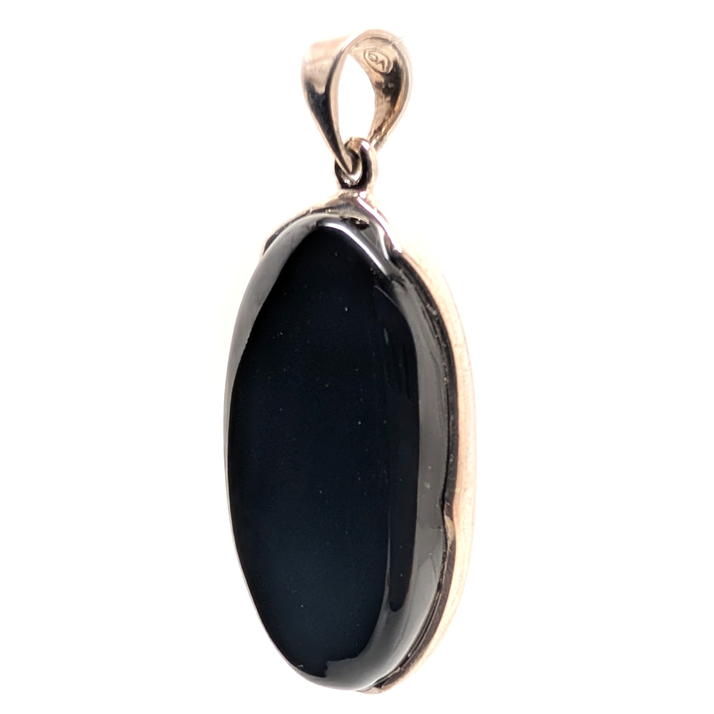 An oval jet-black onyx pendant bezel-set in sterling silver.
