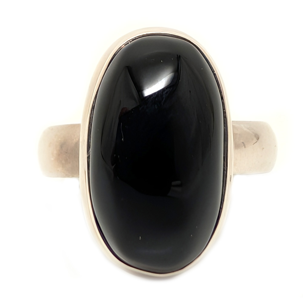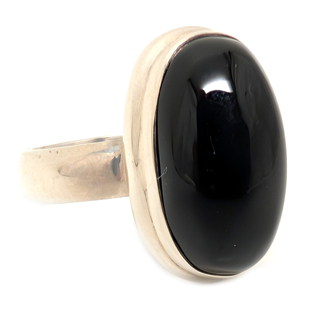 A black onyx ring featuring an oval cabochon bezel-set in a simple sterling silver ring.