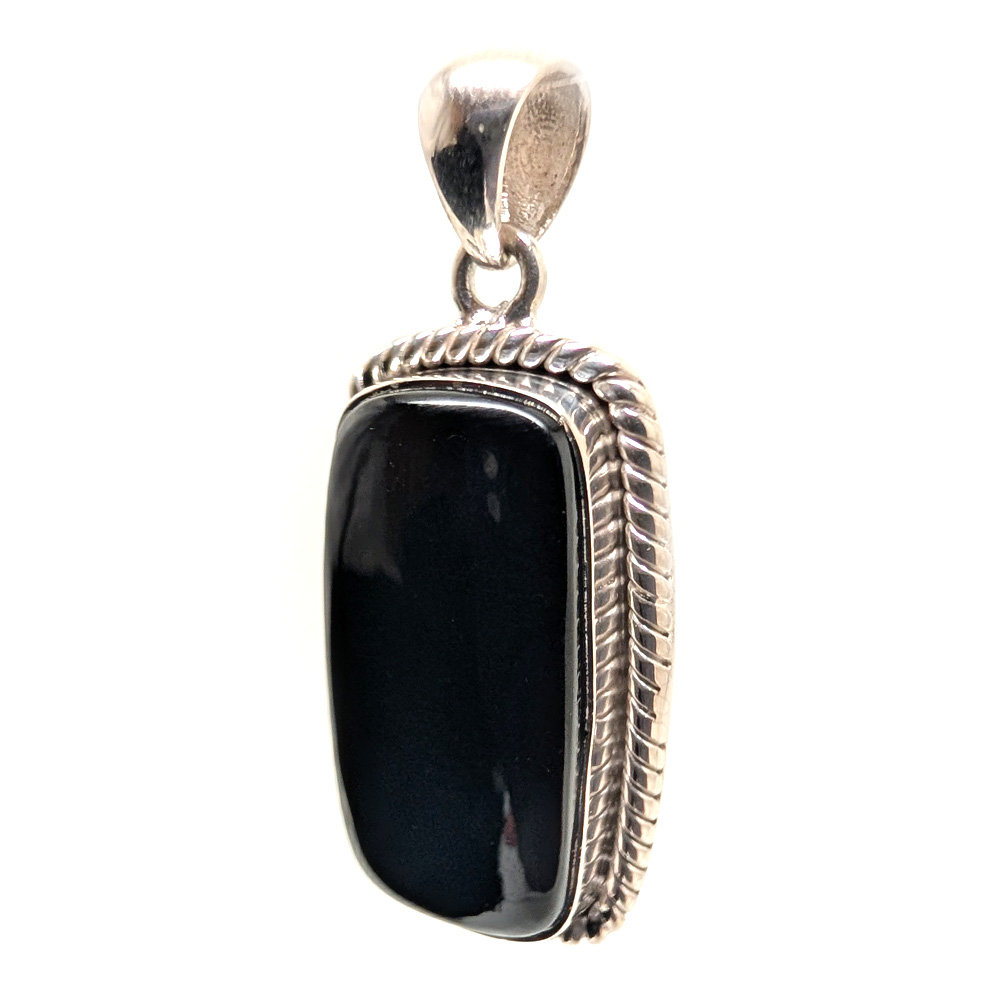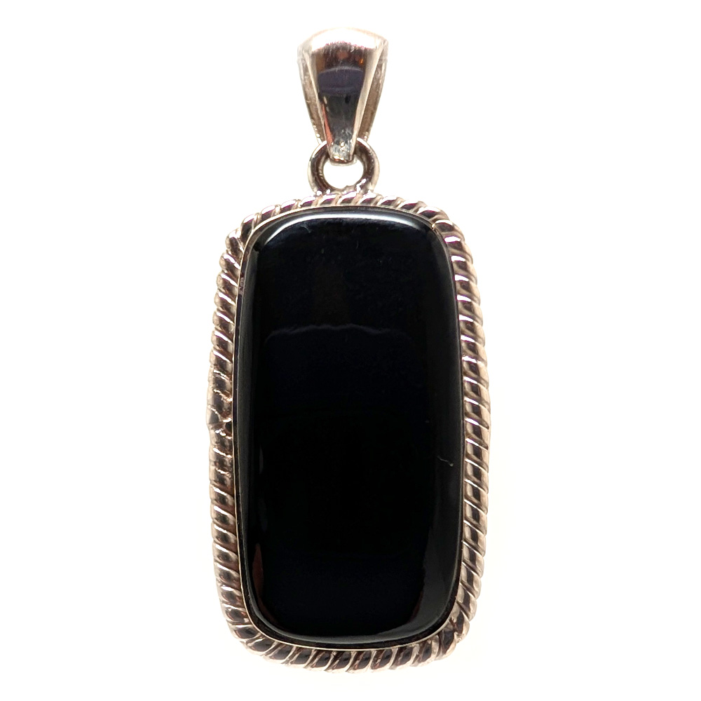 A rectangular jet-black onyx pendant with a rope-style bezel-set in sterling silver.
