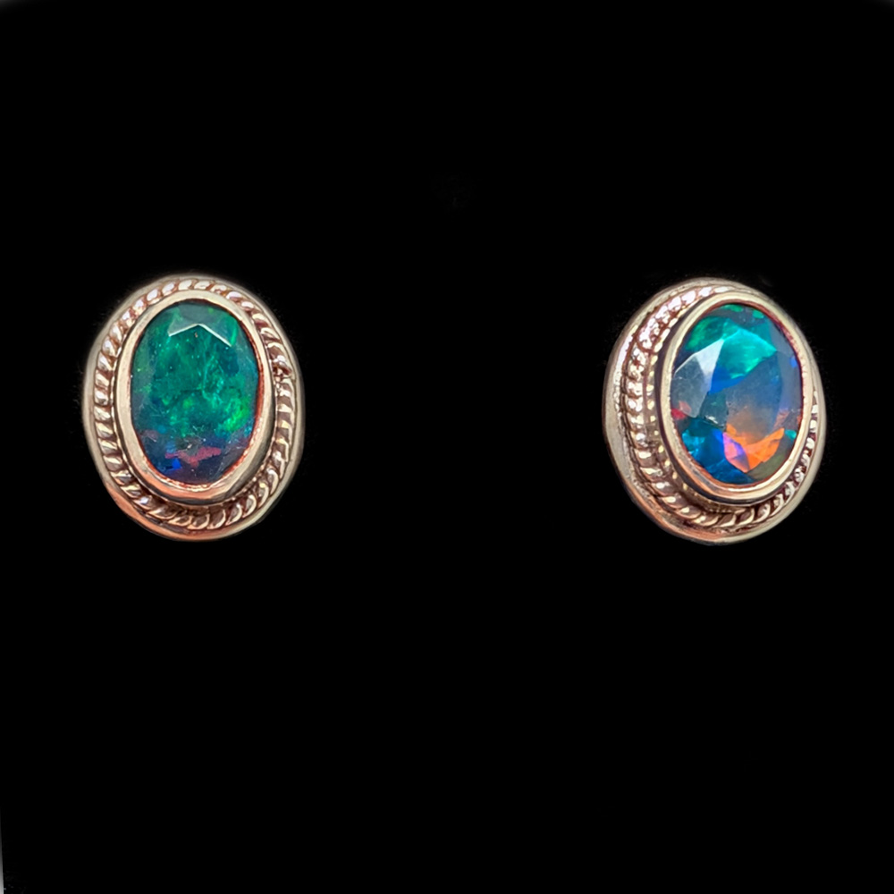 A pair of black opal stud earrings featuring faceted oval black opals from Ethiopia, with sparkly rainbows of color.