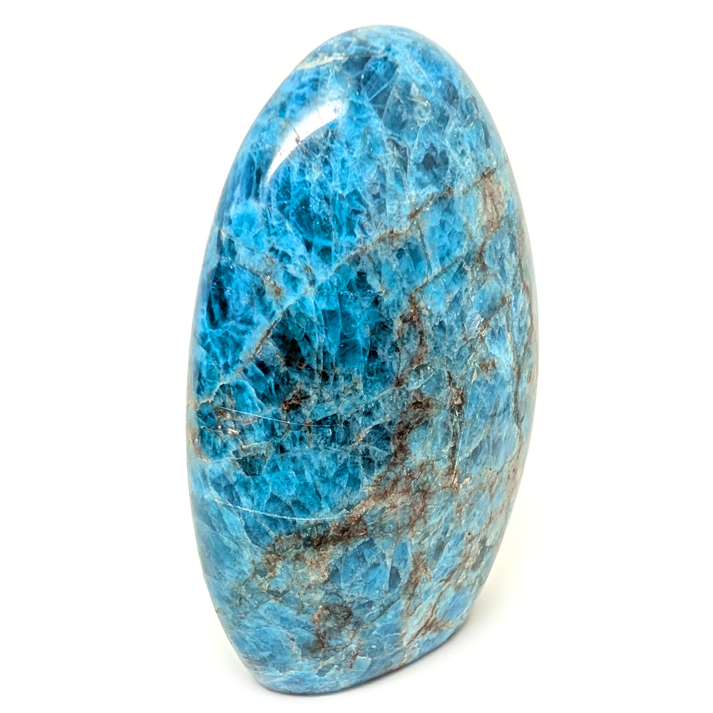 A polished rich teal blue apatite stand-up from Madagascar, with a rounded top and flat bottom.