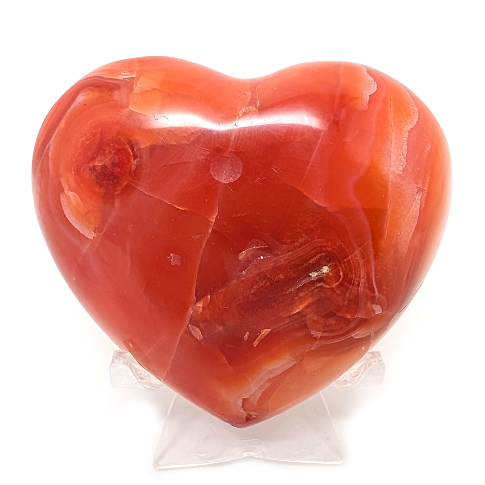 A gorgeous carnelian heart carved out of carnelian agate from Madagascar, featuring light to dark red and dark orange hues, and a little banding.