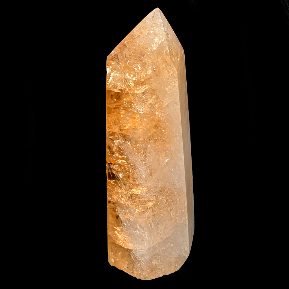 A polished 6-sided tower carved out of rich yellow citrine, glowing with energy! This citrine is heat-treated amethyst from Brazil.