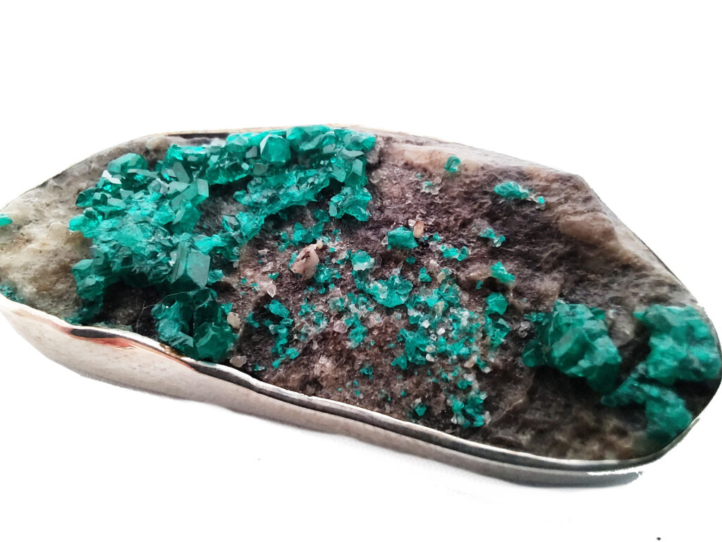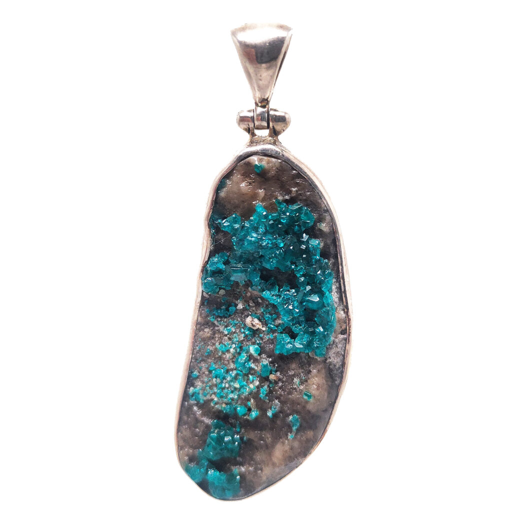 A dazzling sparkly dioptase specimen, set in a simple sterling silver pendant.