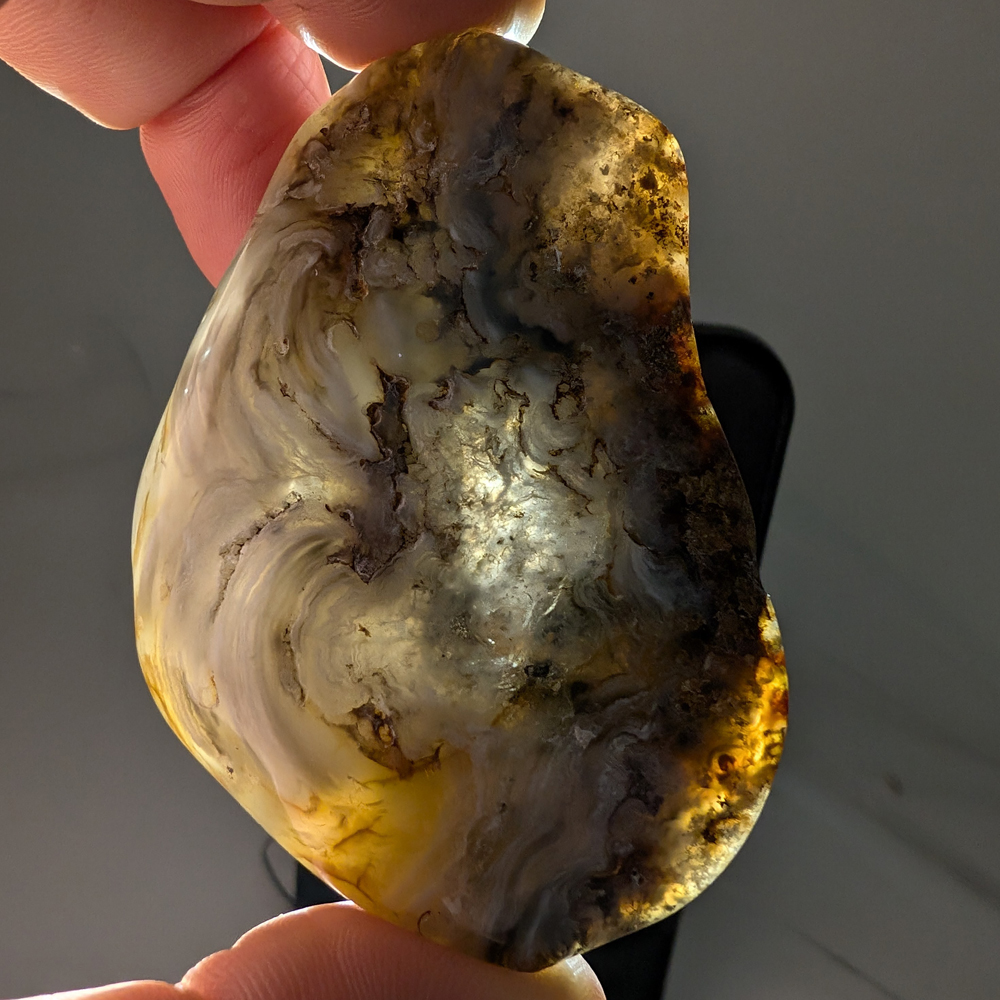 An impressive, large polished enhydro agate from Brazil with ancient water and air encapsulated inside the rock.