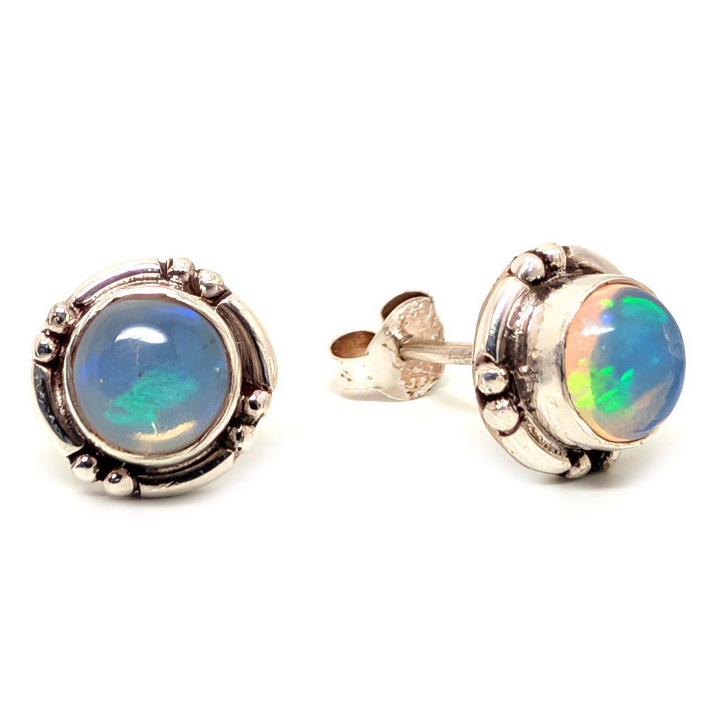 A pair of opal stud earrings featuring vibrant round Ethiopian opal cabochons in a decorative sterling silver setting .