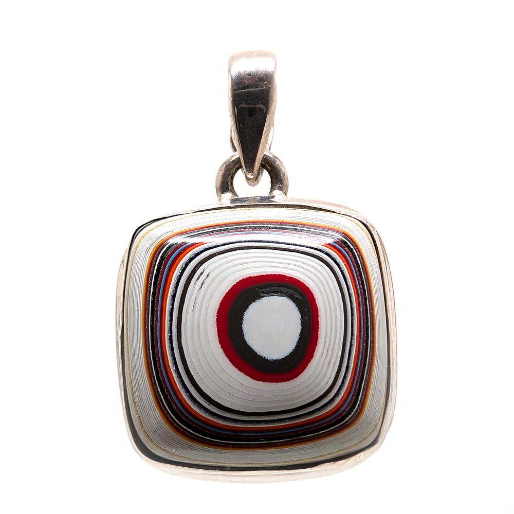 A fordite pendant featuring a square fordite cabochon bezel-set in sterling silver. Fordite, also known as Detroit “agate,” is a rare material cut out of the decades of paint layers accumulated on the walls of paint rooms in old auto factories.