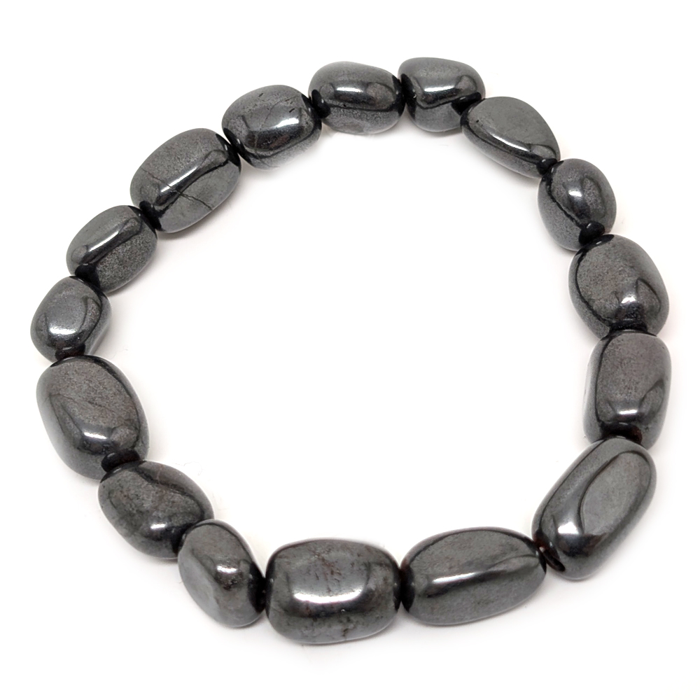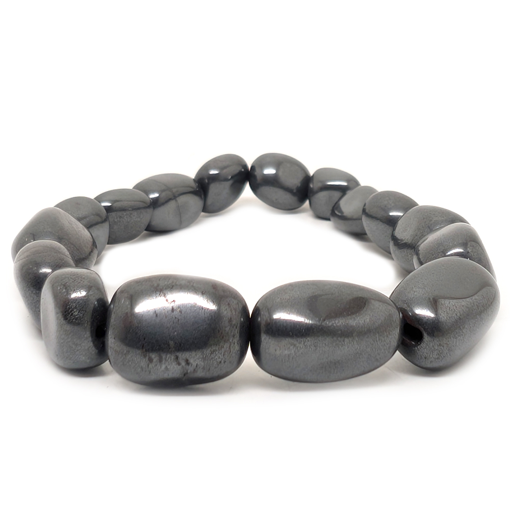 A hematite bracelet featuring tumbled, assymetrical hematite beads on a stretchy cord.