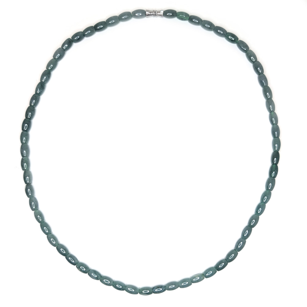 A jade bead necklace featuring darker green jadeite beads with a base metal screw-on clasp.