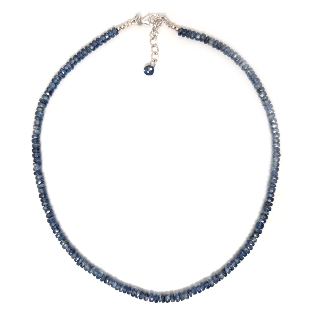 A kyanite necklace featuring faceted beads of translucent blue kyanite, with a sterling silver lobster clasp and an adjustable-length chain extension.