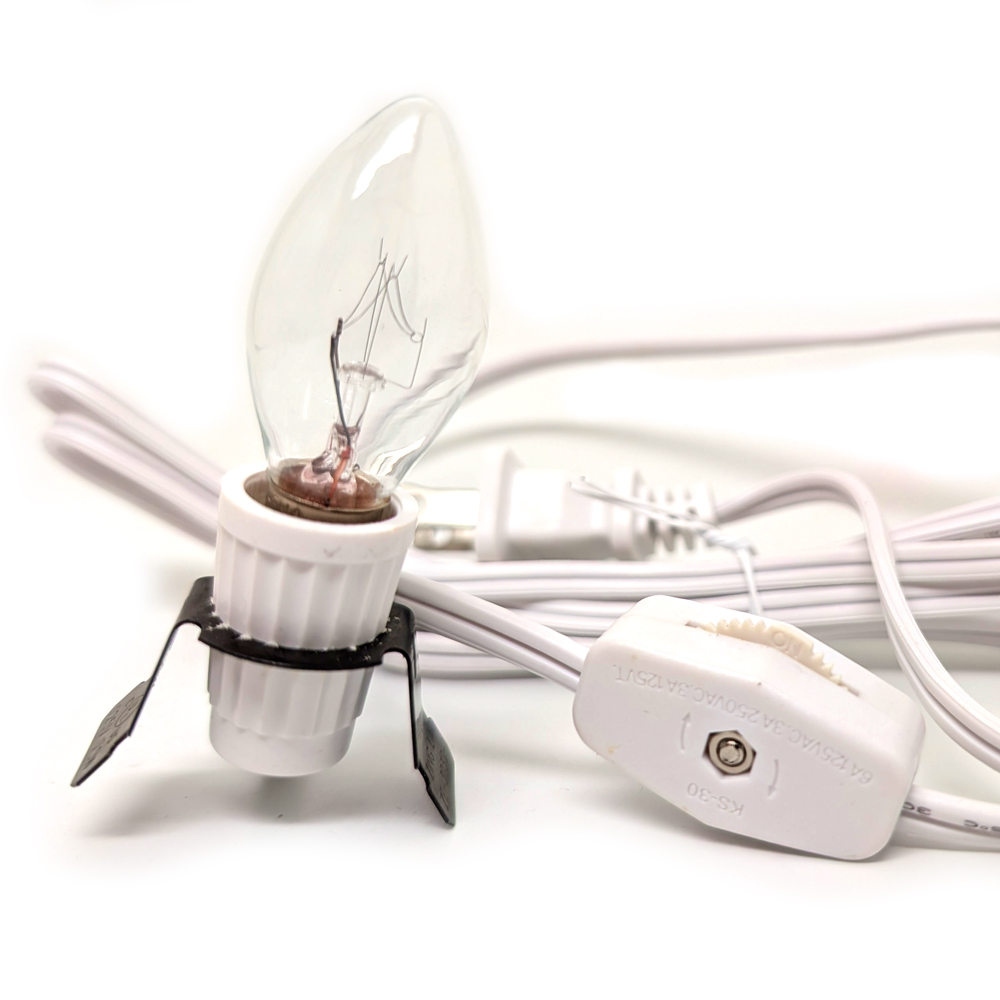 3-foot long white lamp cord with switch and nightlight bulb, featuring a spring clamp around the base of the bulb to keep it in place inside the lamp. Fits inside all our stone and crystal lamps, and plugs into a standard U.S. outlet.
