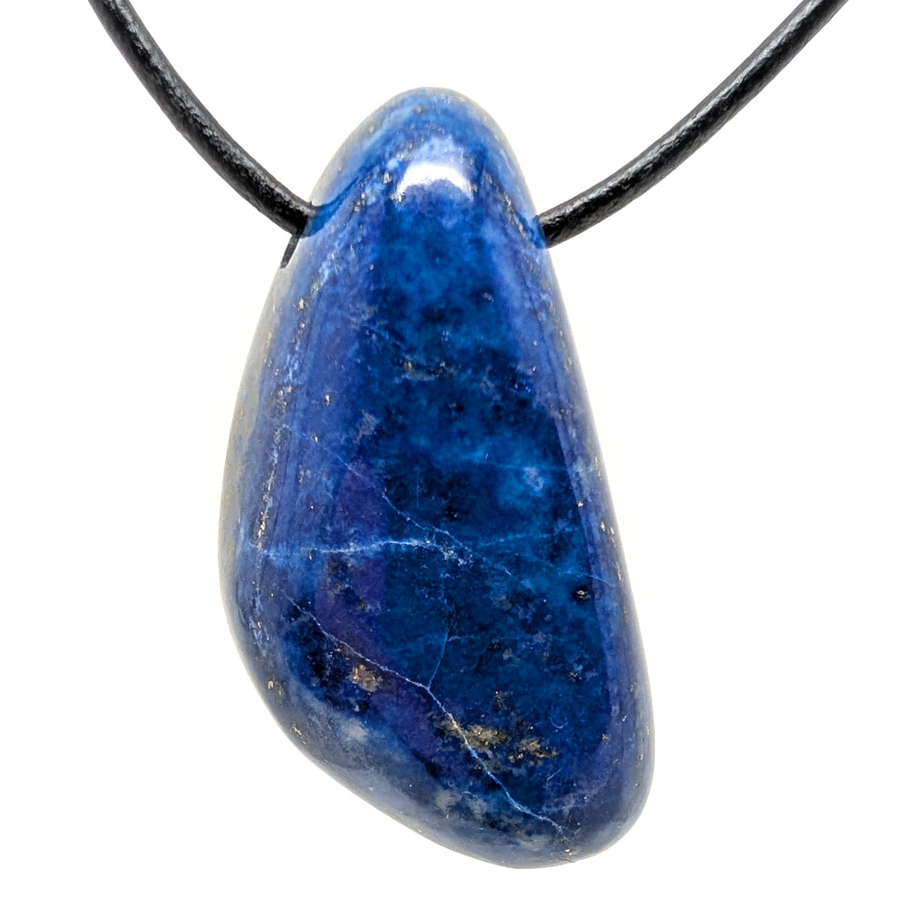 A polished and drilled lapis lazuli pendant from Peru on an adjustable 30″ black leather cord. Reversible, too!