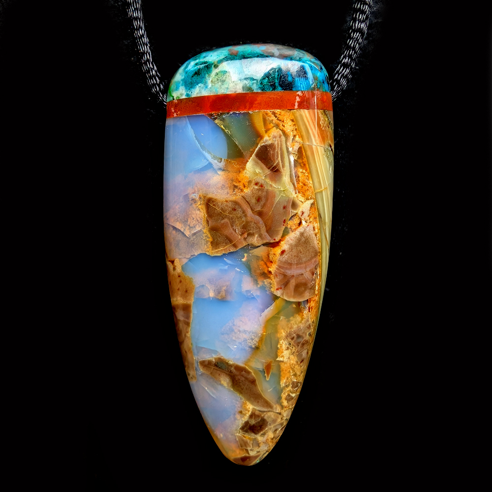 A stunning Oregon Opal Pendant featuring a polished and drilled piece of translucent Oregon Opal in matrix, highlighted with a narrow band of red jasper and topped with a piece of cuprite in chrysocolla. There’s also a little bit of yellow flash to the right below the center of the front. Oregon Opal is scarce and hasn’t been mined in decades. This is a one-of-a-kind piece handcrafted by a PNW miner and jewelry maker. Adjustable black leather cord included.