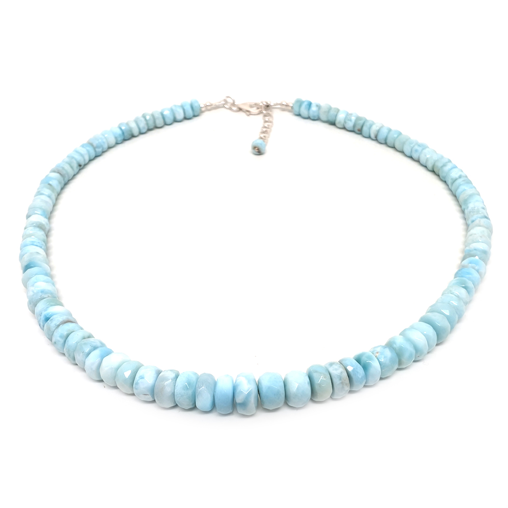 A graduated faceted larimar bead necklace with a sterling silver lobster claw clasp and adjustable chain extension.