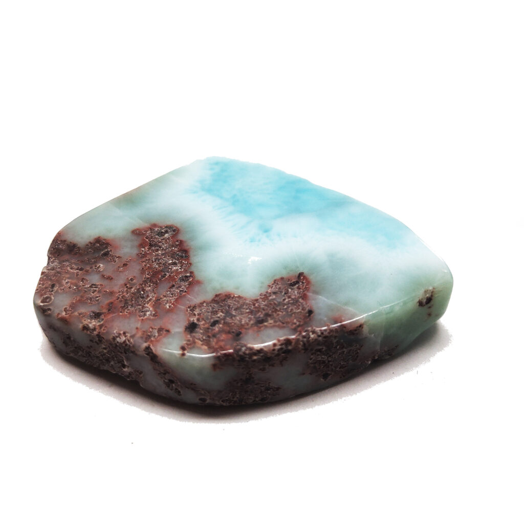 A gorgeous slice of larimar from the Dominican Republic, polished on all sides to show the white and blue hues.