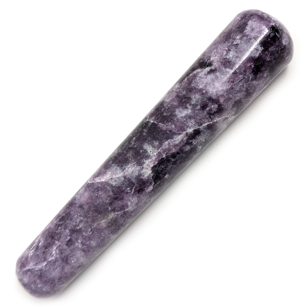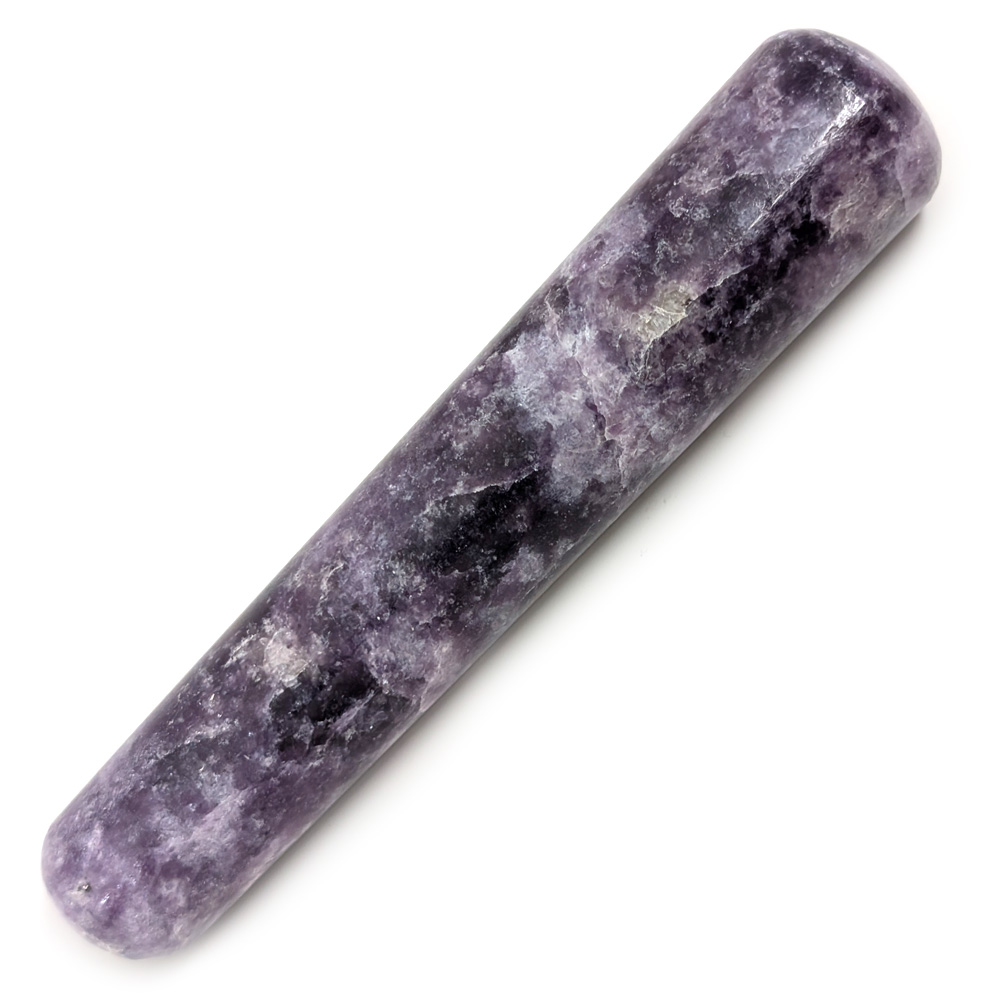 A club-shaped lepidolite massage wand featuring rich purple hues. Massage wands are a great way to stimulate blood flow within the circulatory system.