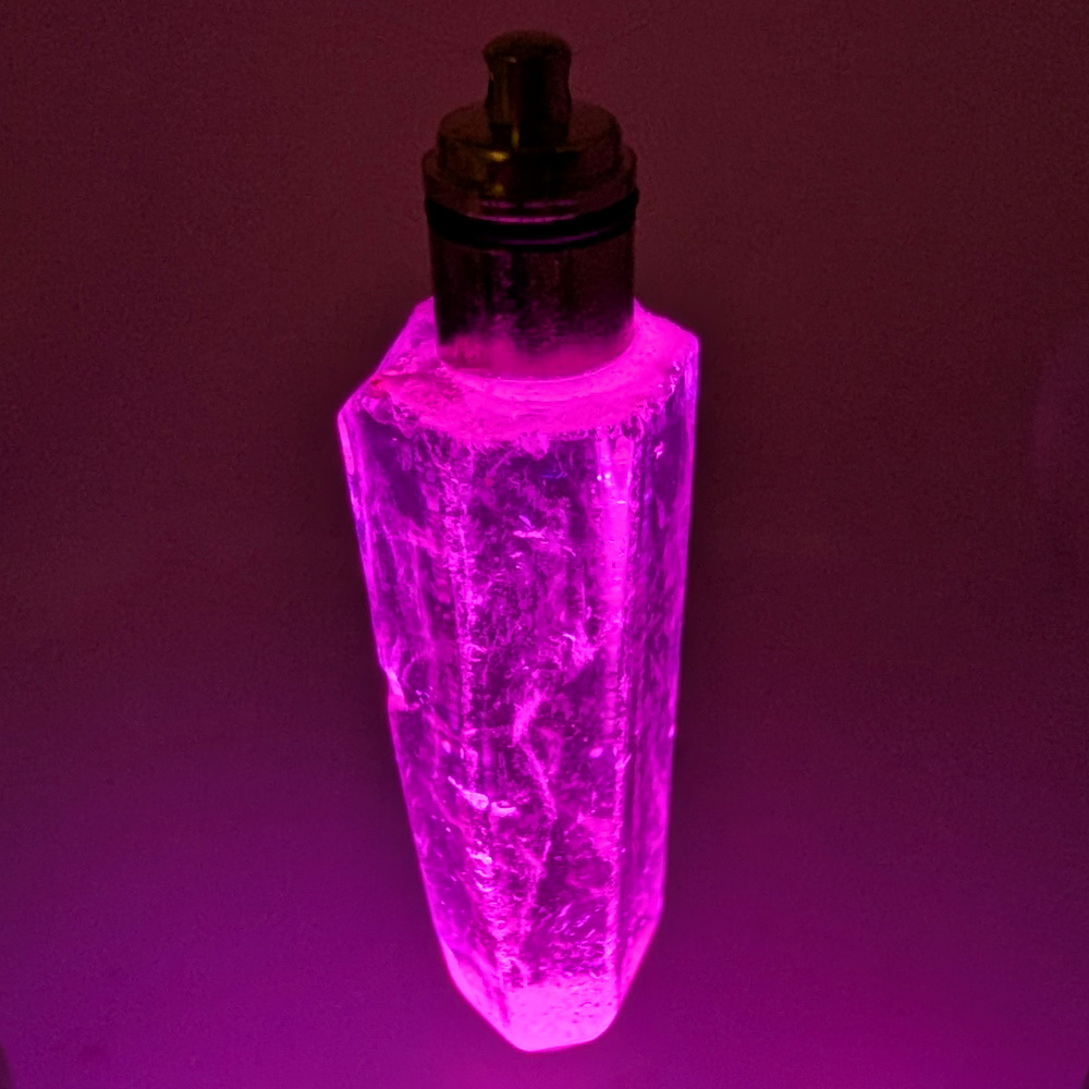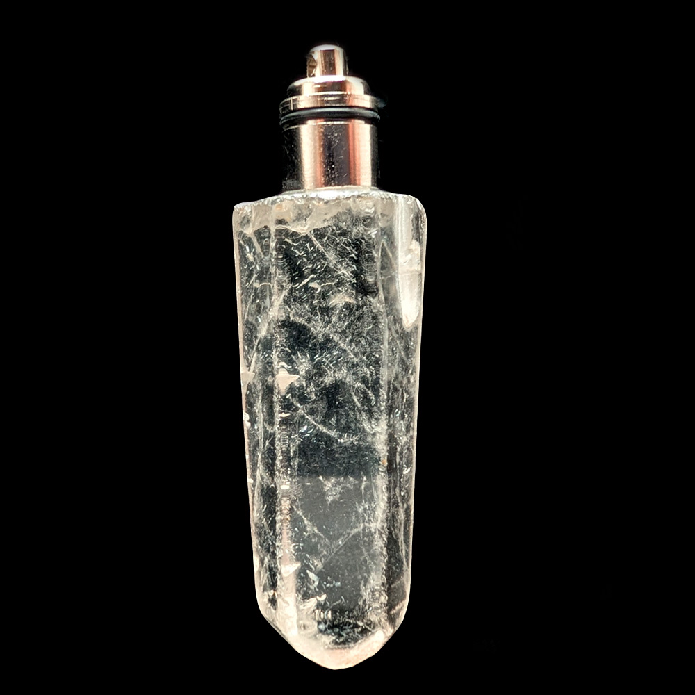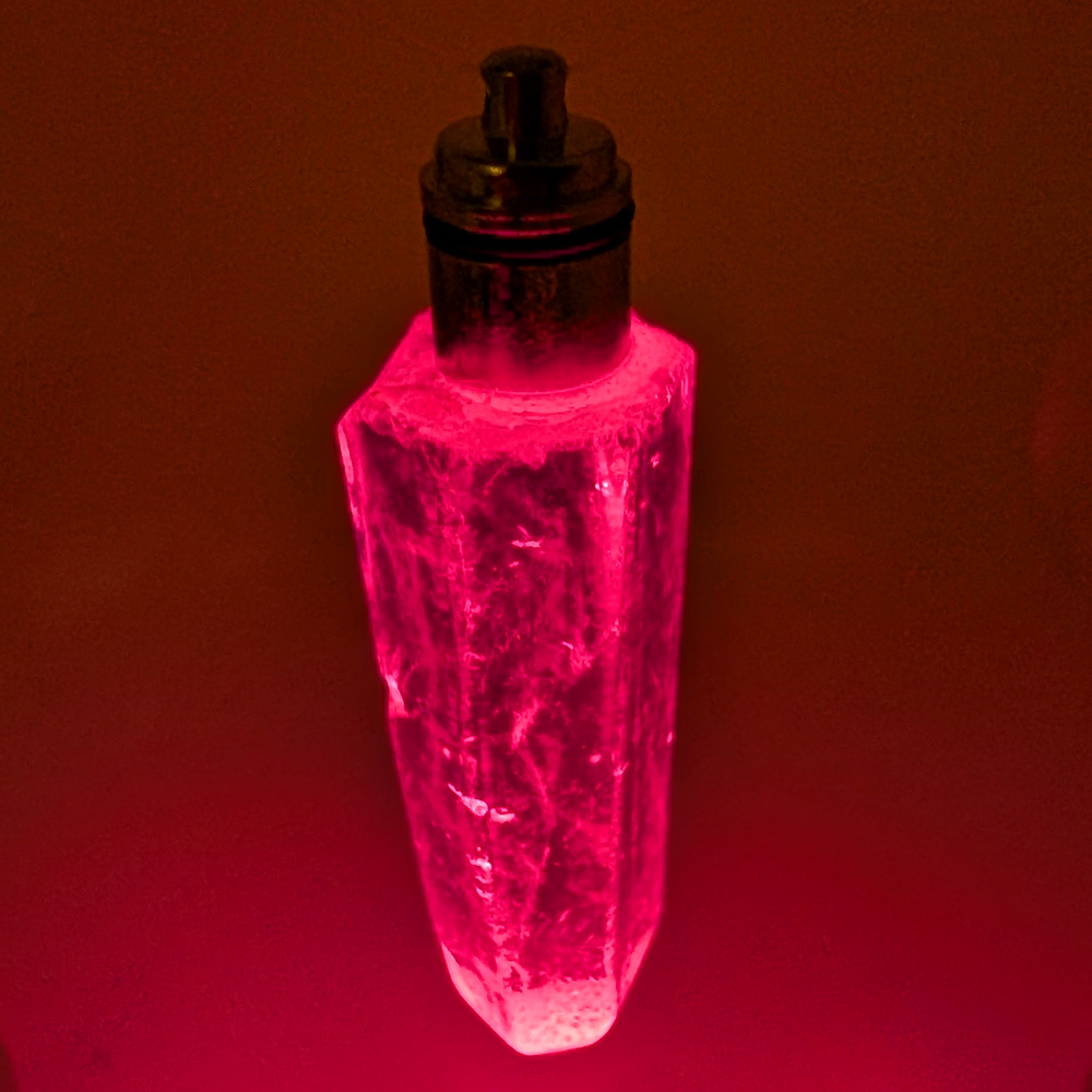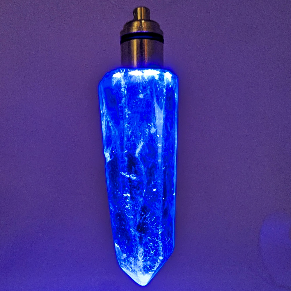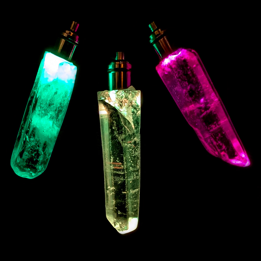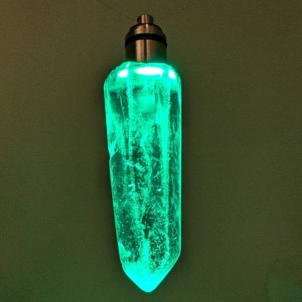 A light-up quartz crystal pendant with a built-in color-changing LED bulb. Quartz crystal has been tumble-polished. You simply twist the stainless steel cap to turn it on or off, and it cycles through all the colors of the rainbow.