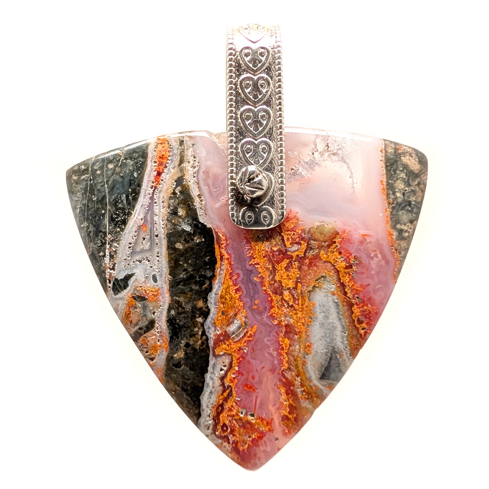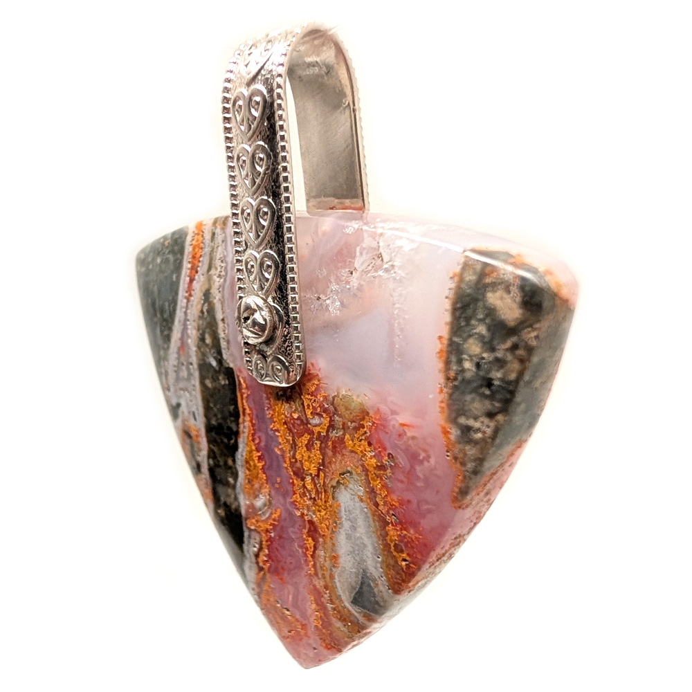 A magma chalcedony pendant featuring a large triangular cabochon with an ornate sterling silver bail. This piece displays bright orange and pink hues and features areas of translucent light pink chalcedony.
