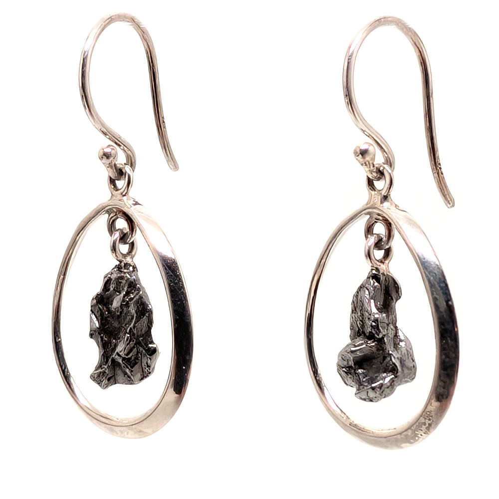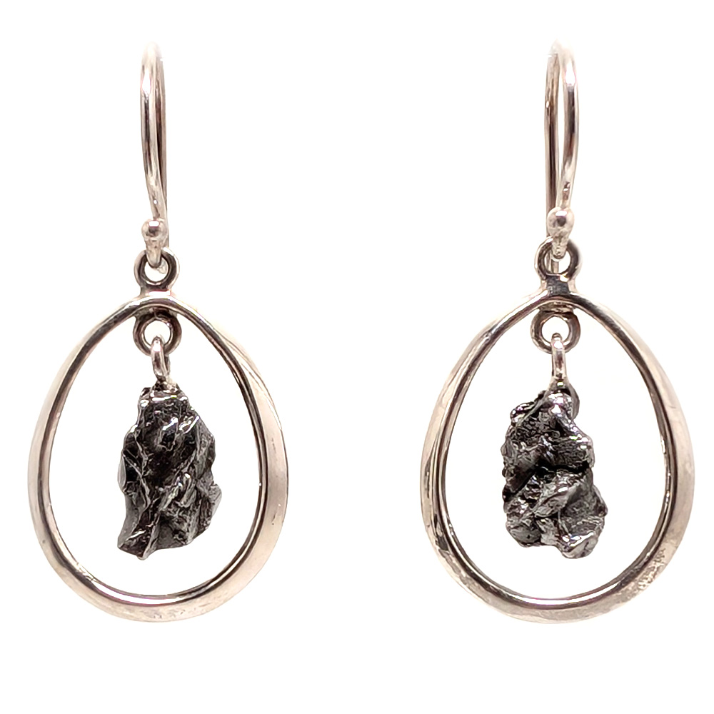 A pair of meteorite earrings featuring natural Campo del Cielo meteorites suspended inside a teardrop sterling silver outline with sterling silver ear hooks.