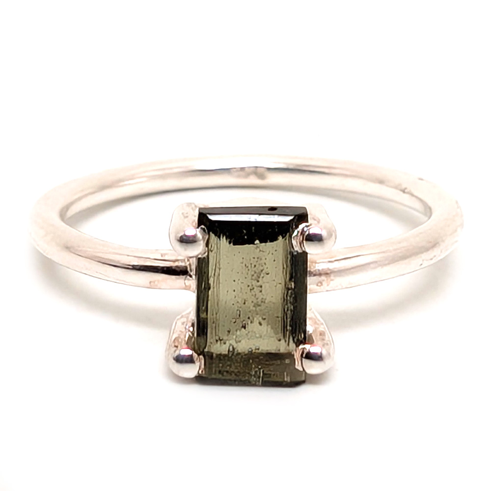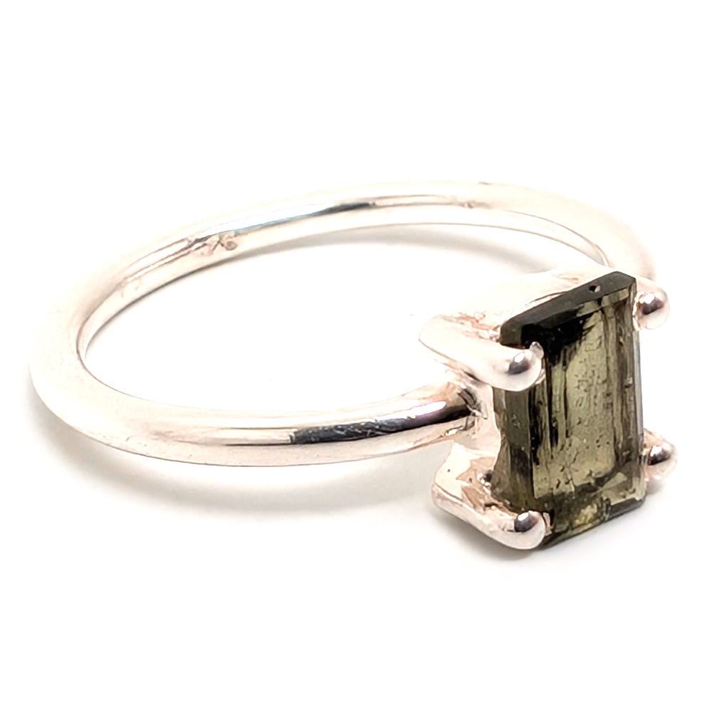 Moldavite Emerald-Faceted Sterling Silver Ring; size 5