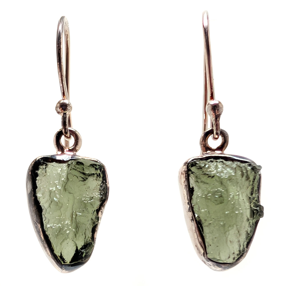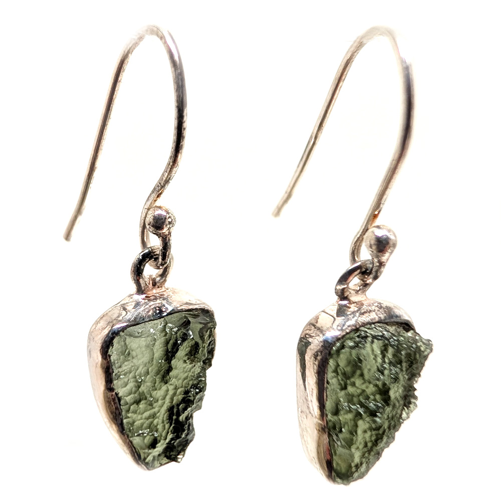 A pair of moldavite earrings featuring pieces of all-natural rough moldavite bezel-set in simple sterling silver dangle earrings. The gem from outer space!