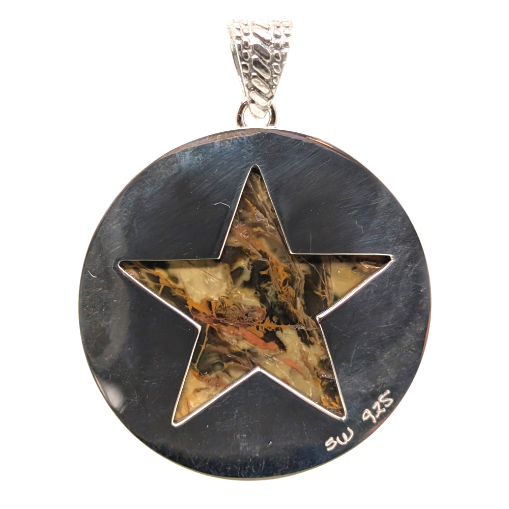 A lovely multi-colored morrisonite pendant featuring a large round morrisonite cabochon bezel-set in sterling silver, with a star cut-out in the back for added flair, by Oregon jewelry designer Steve Wolf.