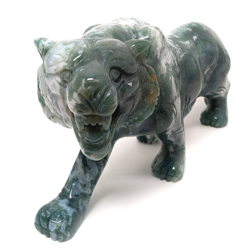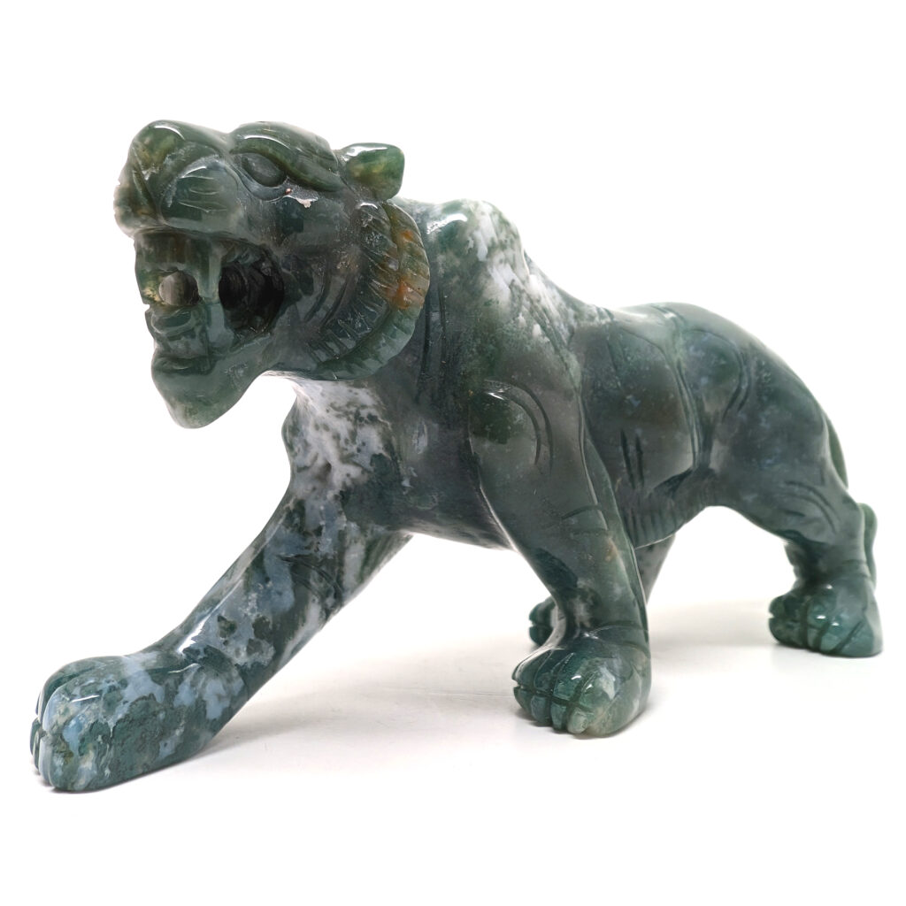 Moss agate sculpture of a roaring lioness.