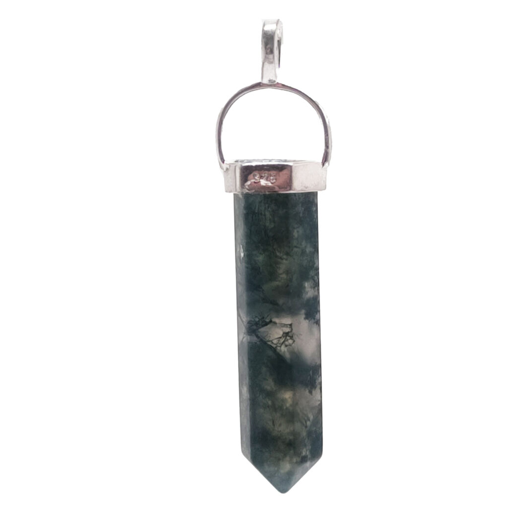 A beautiful crystal-shaped pendant carved out of moss agate with a simple sterling silver bail.