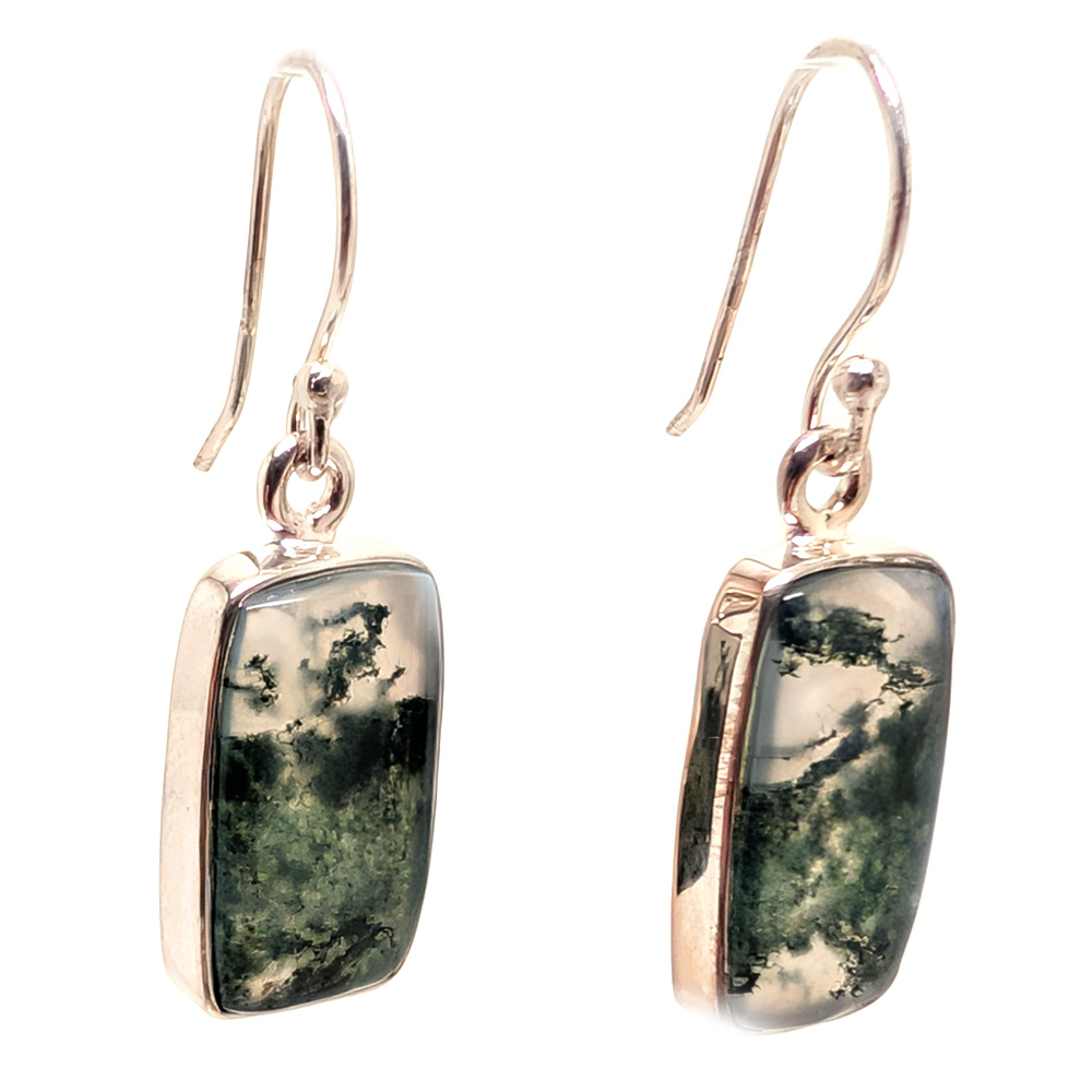 A pair of moss agate earrings featuring rectangular clear moss agate cabochons with wispy green moss-like inclusions from India, bezel-set in simple sterling silver dangle earrings.