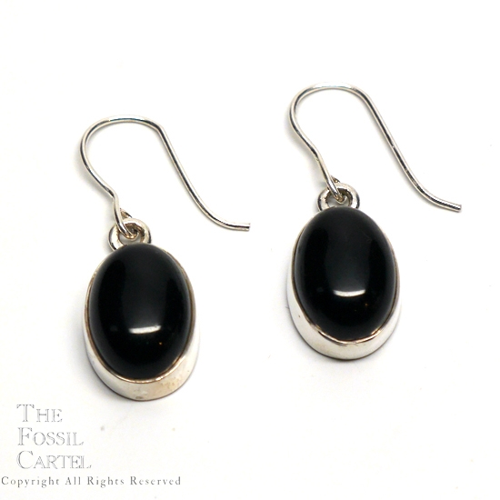 Simple black onyx oval cabochon dangle earrings set in sterling silver. Stone dimensions approx 15 x 11 mm with an entire length of approx 31mm.