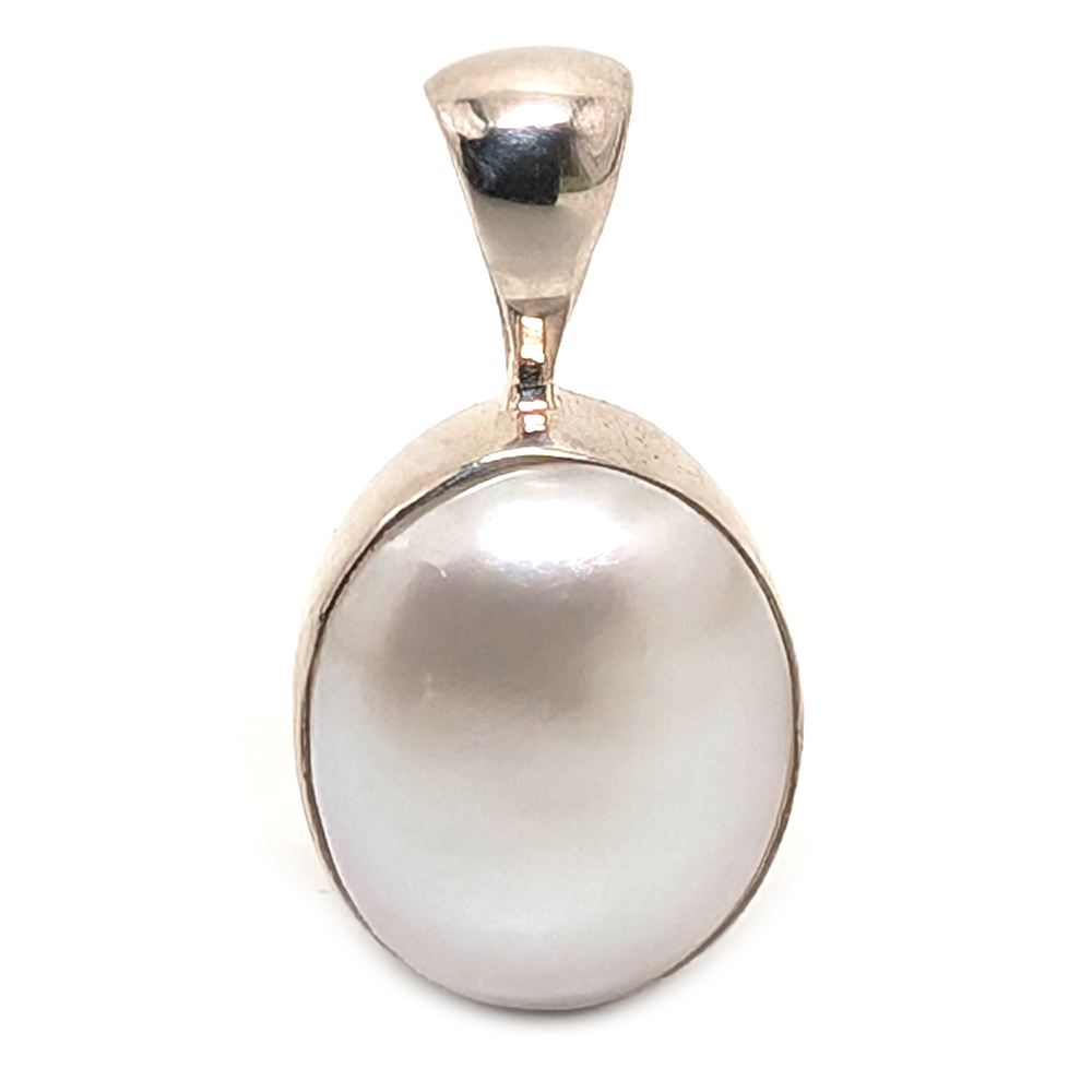 This simple yet elegant pearl pendant features a small oval freshwater pearl cabochon bezel-set in sterling silver.