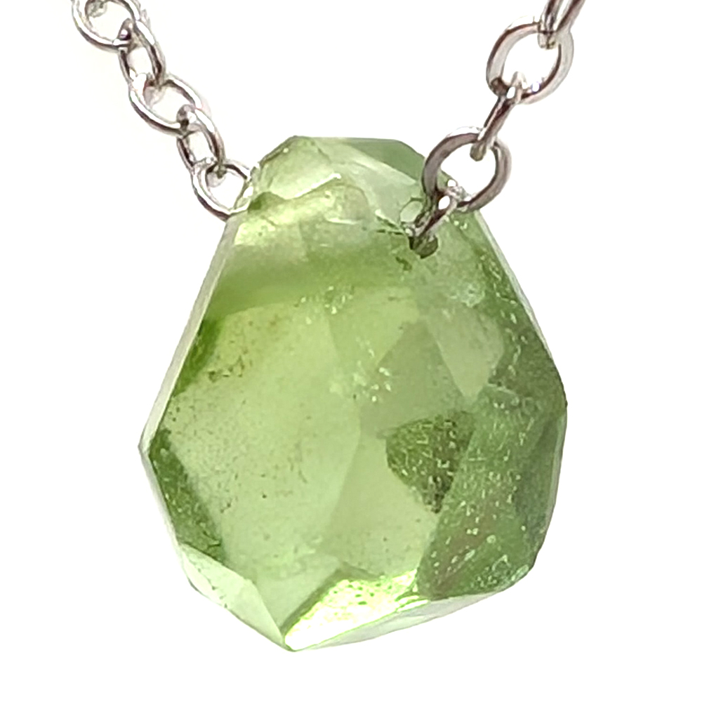 A peridot pendant featuring a clear gemmy faceted piece of peridot from the Pakistan/Afghanistan border area, shaped, polished and drilled, with an included 18″ stainless steel chain.