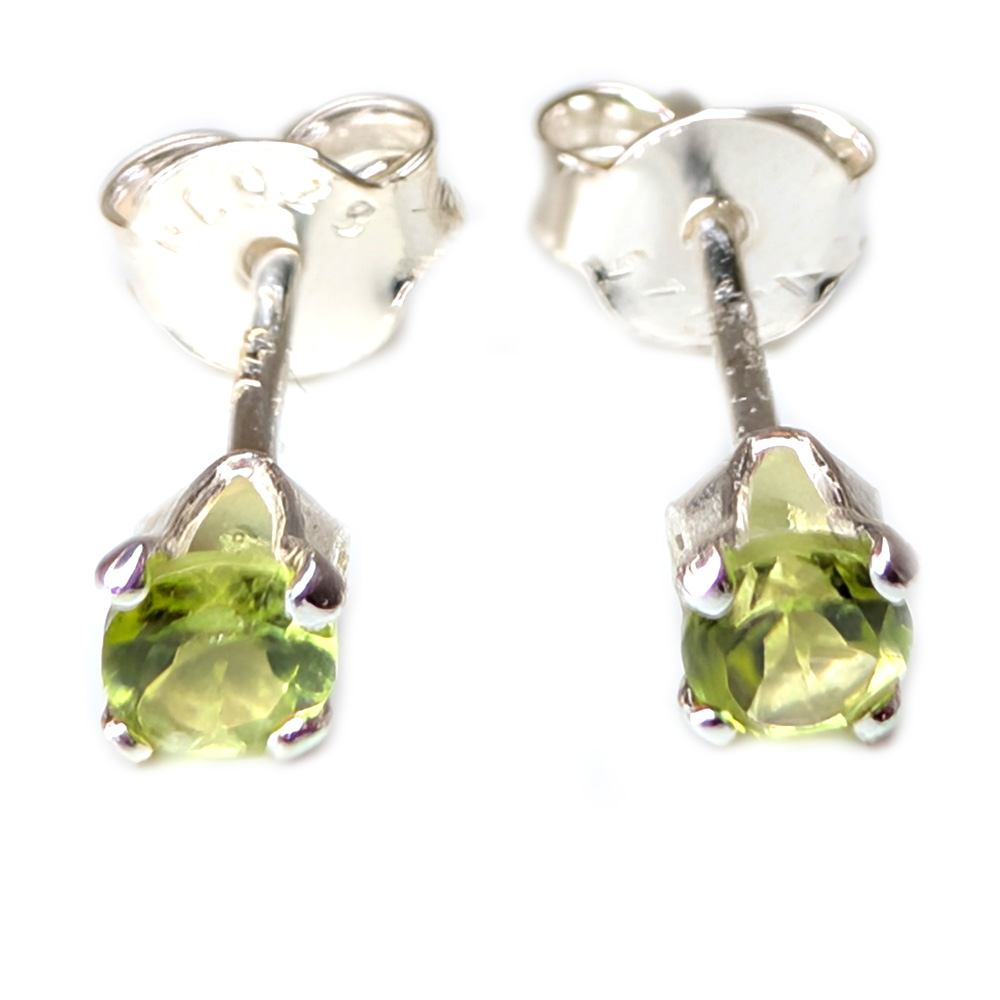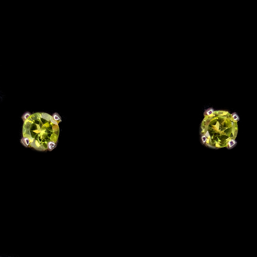 A pair of peridot stud earrings featuring small round-faceted peridot gemstones, prong-set into simple sterling silver stud earrings.