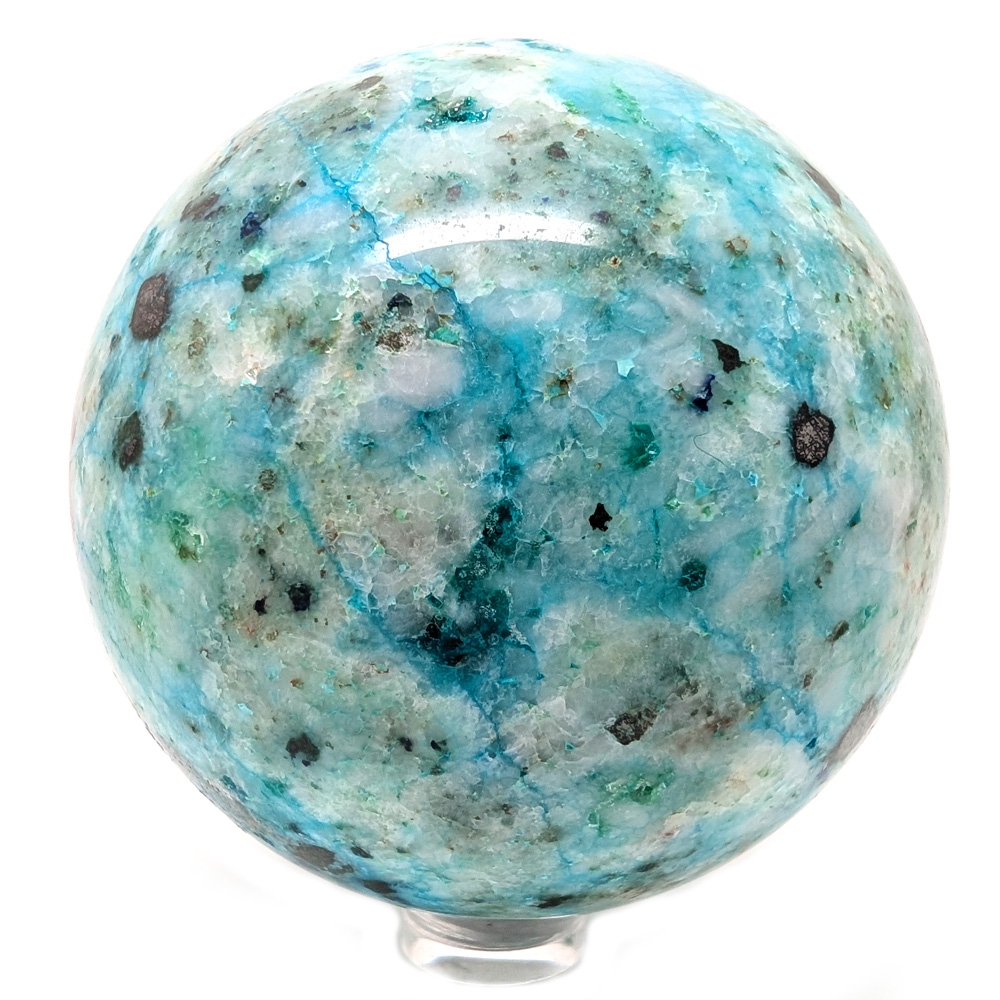 Phoenix Stone sphere from Africa, featuring pretty blue chrysocolla in quartz with hematite. May also contain traces of all sorts of copper-based minerals including malachite, turquoise, ajoite, dioptase, shattuckite and azurite.