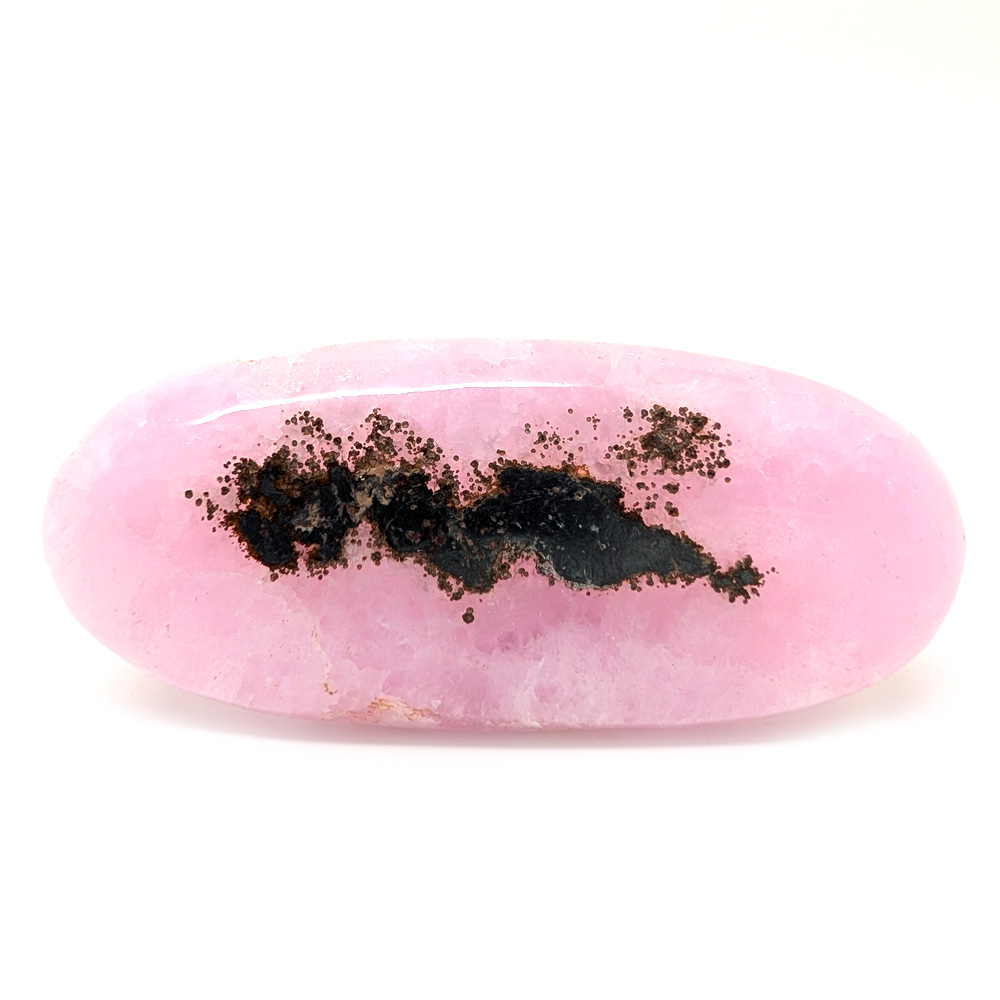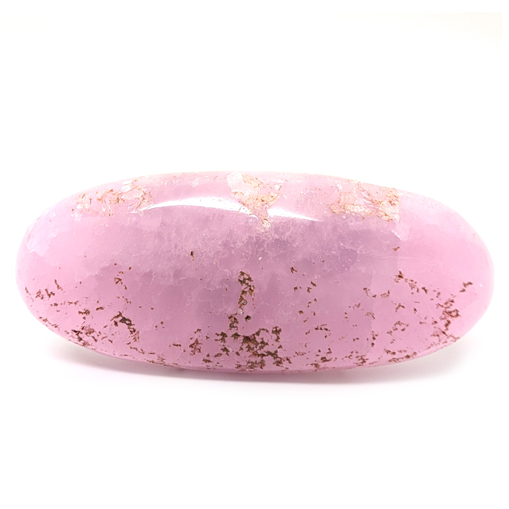 A pink aragonite palm stone from Afghanistan. Gorgeous unique color and very rare mineral. Smooth on one side and some exposed crystals and some dark grey matrix on the other side.