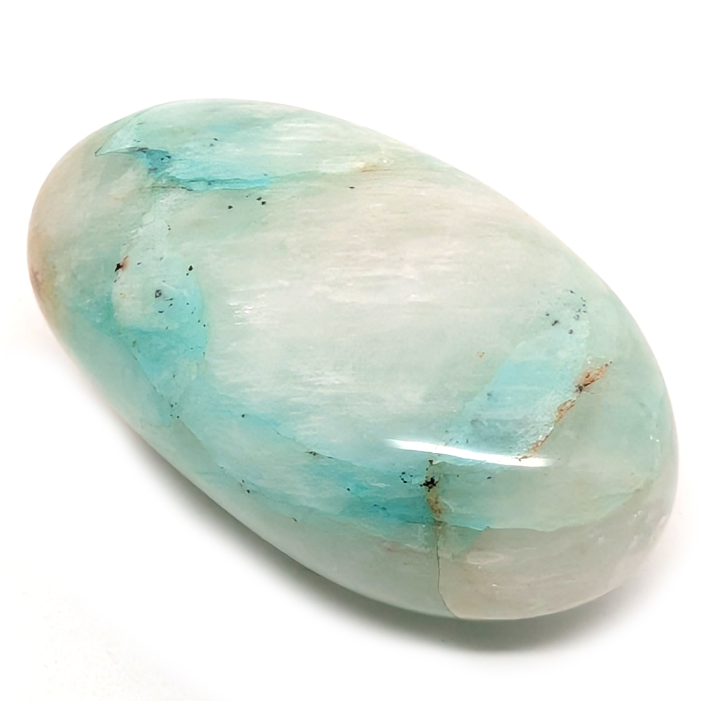 A polished quantum quattro palm stone with bluish green veins in quartz, called a palm stone because it is sized to fit in your palm. Aka chrysocolla in quartz.