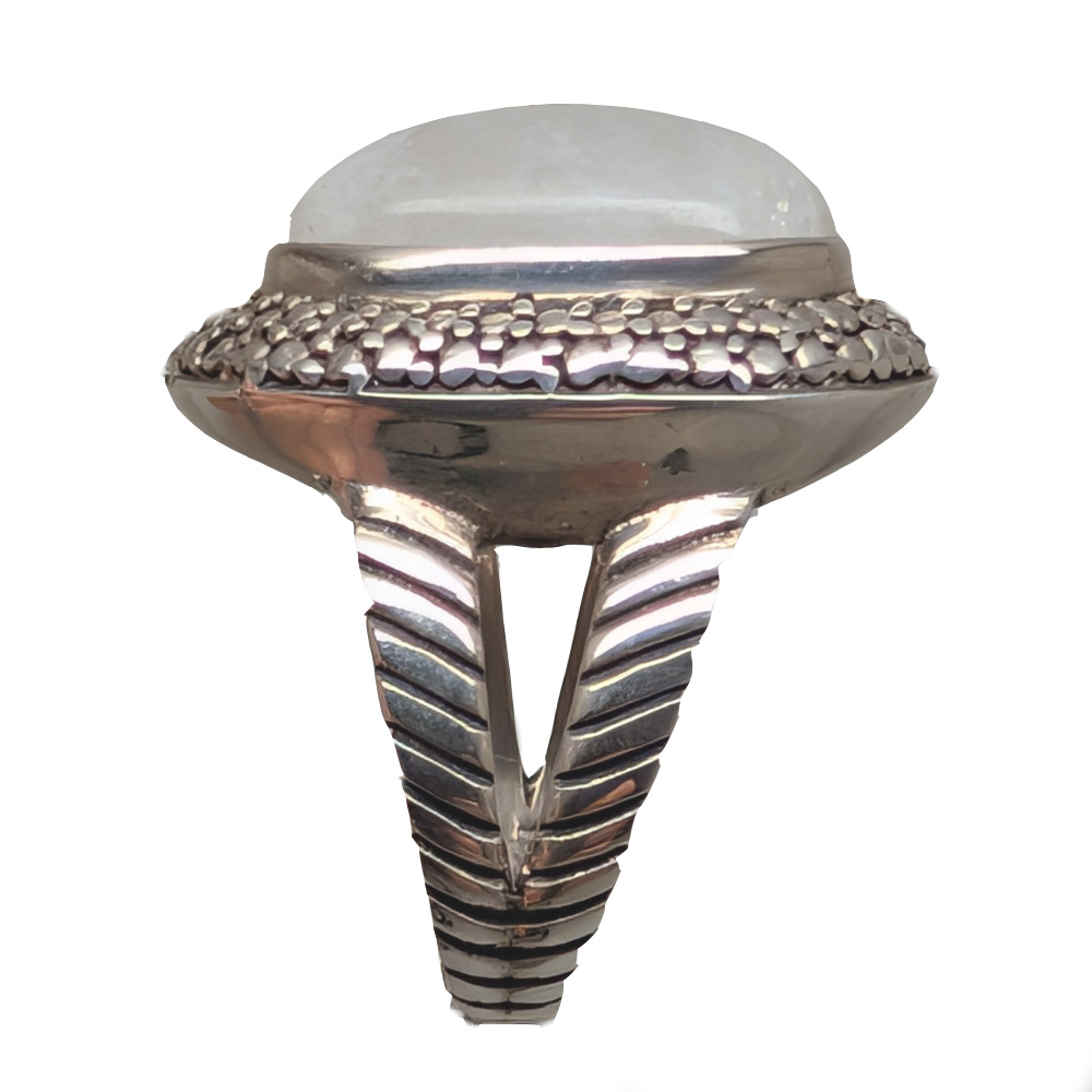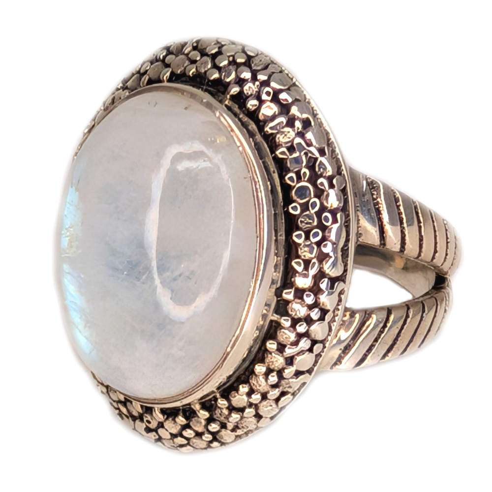 A rainbow moonstone ring featuring an oval cabochon bezel-set in an ornate sterling silver ring with a split-shank ring band.