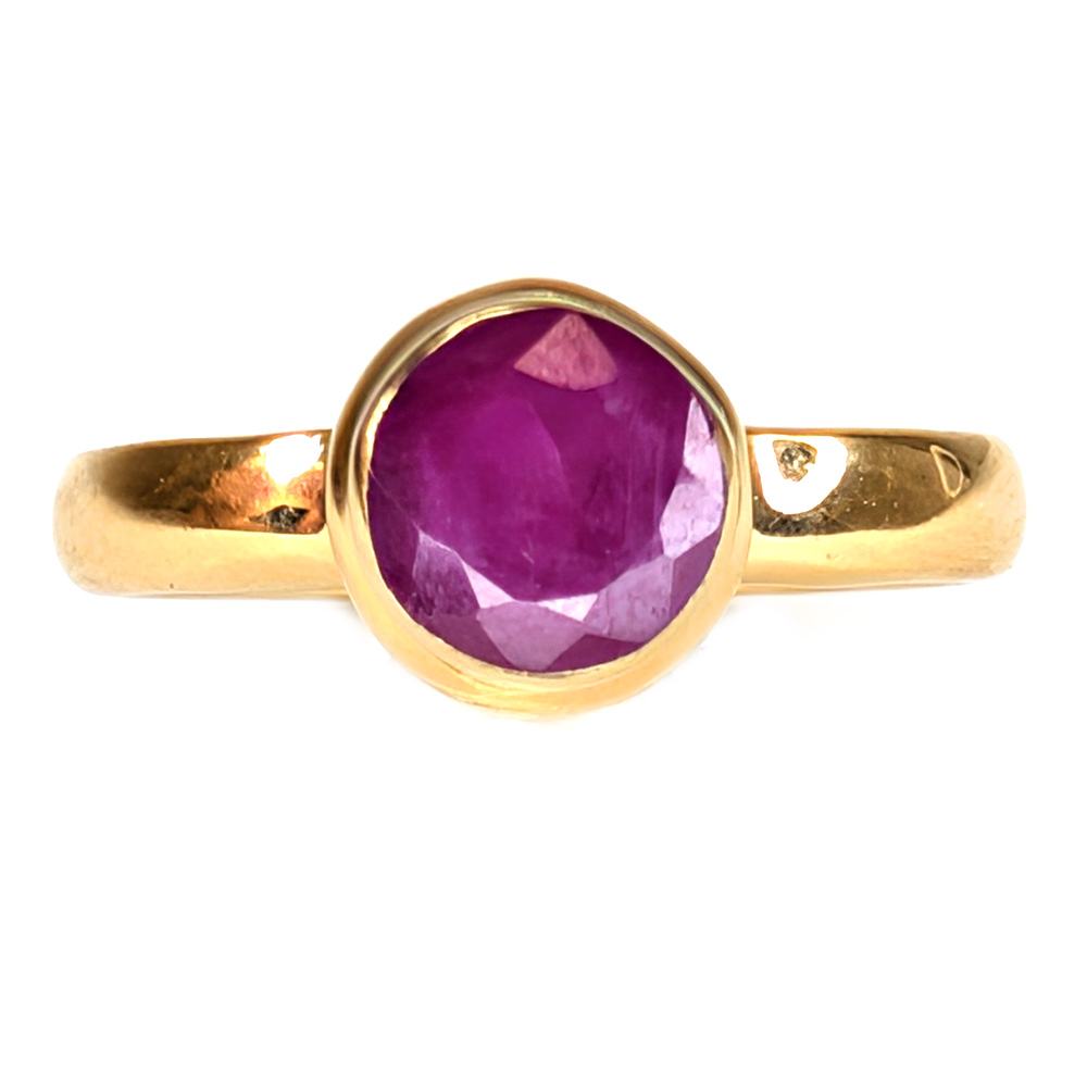 A ruby ring featuring a round faceted ruby bezel-set in a simple gold vermeil band.
