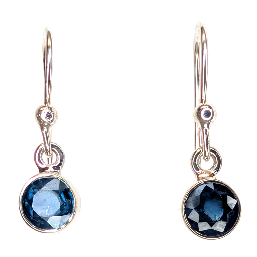 A pair of blue sapphire earrings featuring round faceted sapphires bezel-set in simple sterling silver dangle earrings.