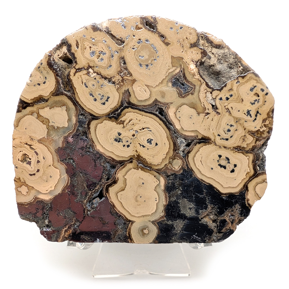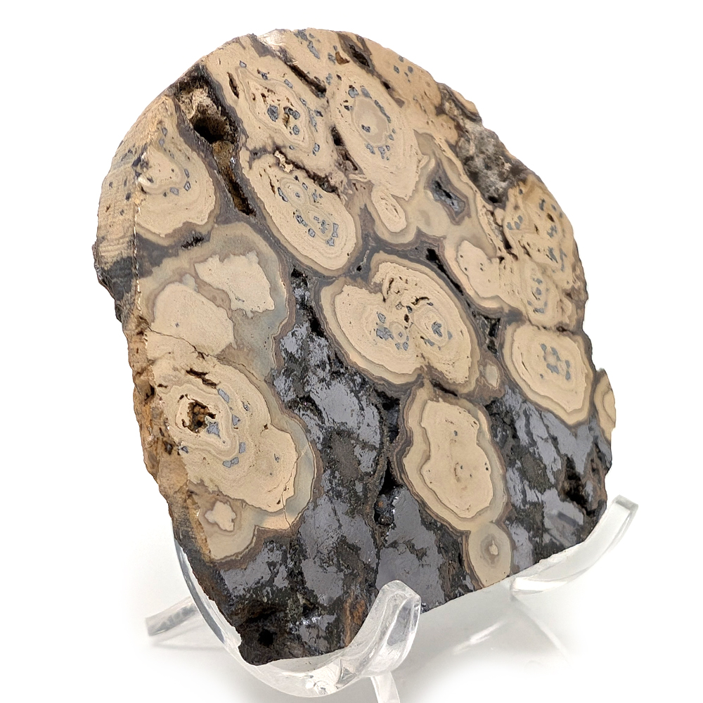 Schalenblende consists of banded concentric layers of sphalerite (brown), wurtzite (yellow), marcasite and/or pyrite (brass color), and galena (silver). Cut and polished into slabs to show off its contrasting botryoidal bands, schalenblende feels remarkably heavy due to its high metal content. Found in Poland, its name is German, translated as “shell ore” in allusion to its layered structure. Metaphysically, it is said to aid in grounding and protection, as well as boosting the immune system.