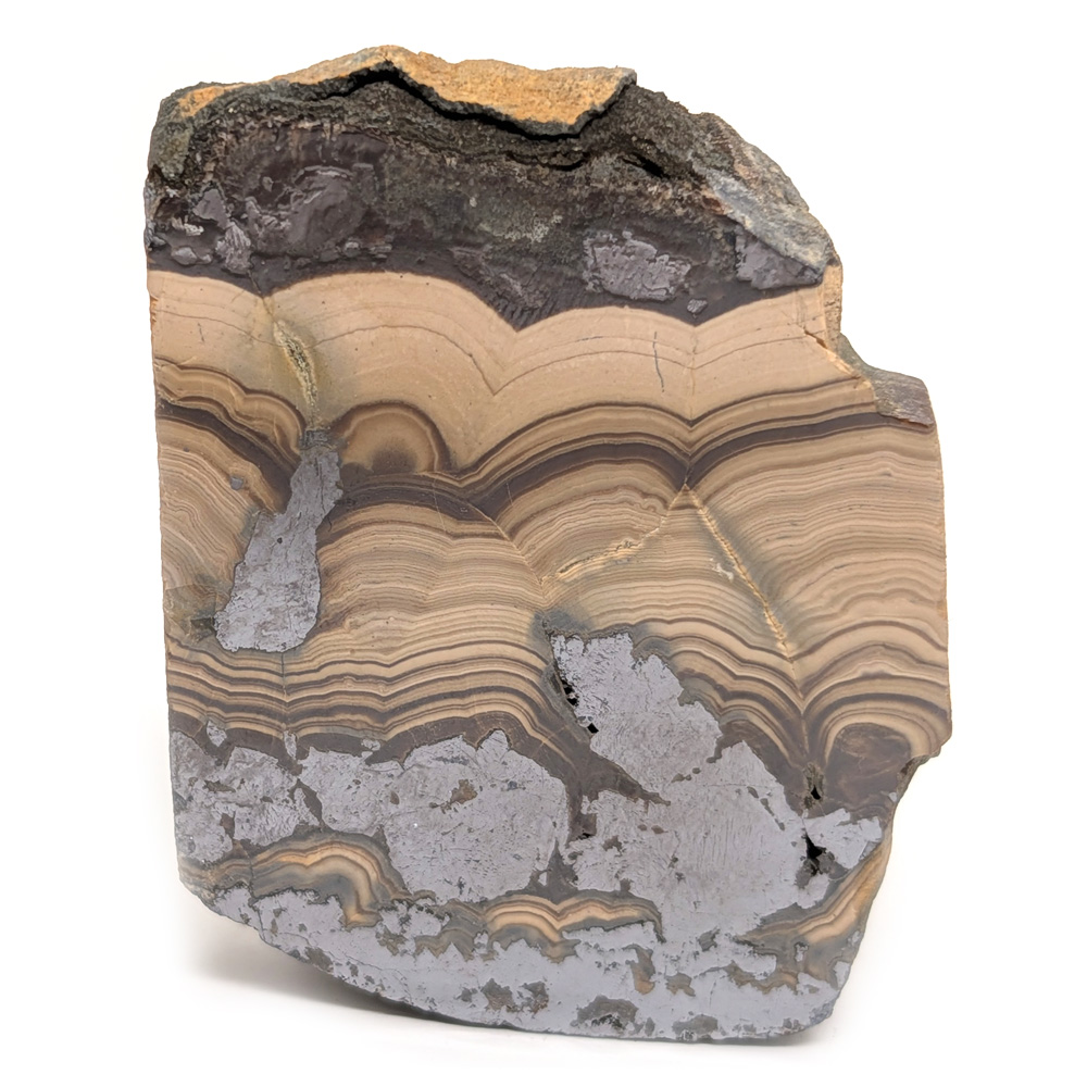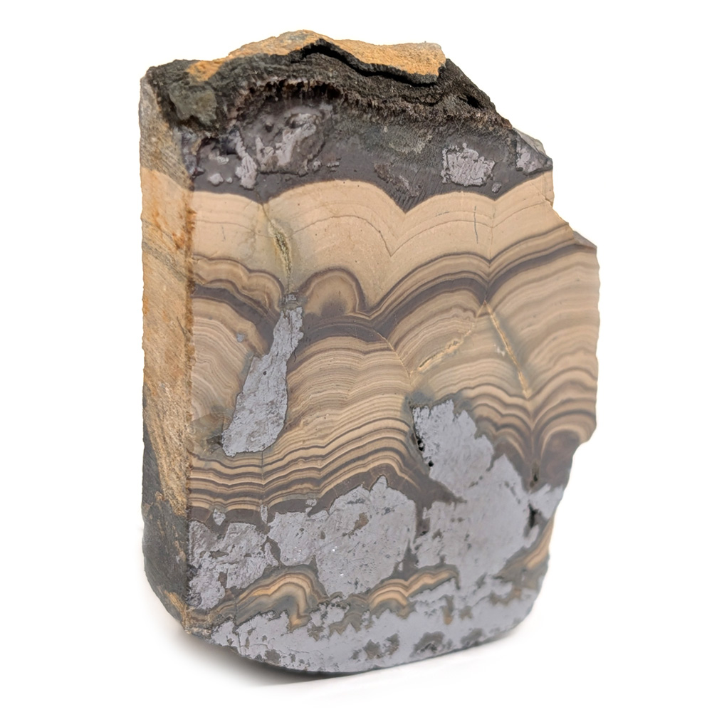 Schalenblende consists of banded concentric layers of sphalerite (brown), wurtzite (yellow), marcasite and/or pyrite (brass color), and galena (silver). Cut and polished into slabs to show off its contrasting botryoidal bands, schalenblende feels remarkably heavy due to its high metal content. Found in Poland, its name is German, translated as “shell ore” in allusion to its layered structure. Metaphysically, it is said to aid in grounding and protection, as well as boosting the immune system.