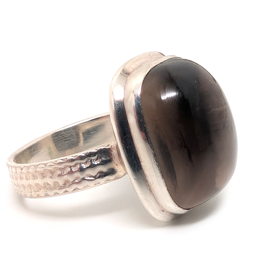 A smoky quartz ring featuring a nice, clear, pillowy rectangular smoky quartz cabochon, bezel-set in sterling silver with a detailed ring band.